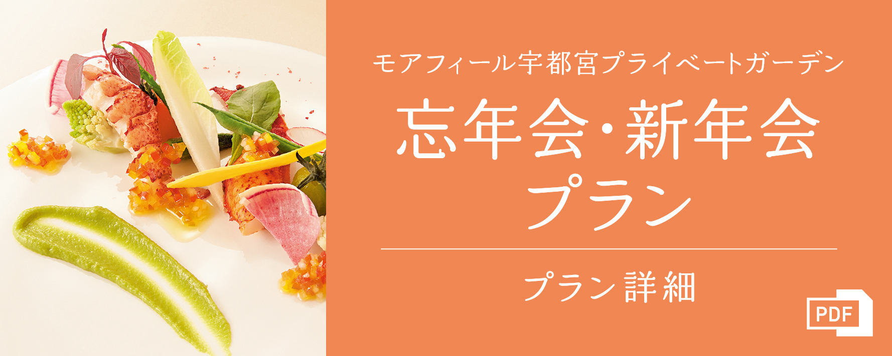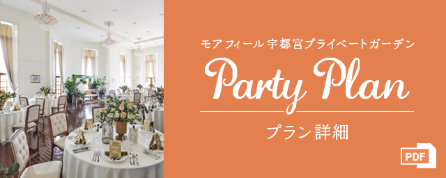 モアフィール宇都宮プライベートガーデンのパーティーに華を添えるのが、こだわりあふれる料理の数々。宴会・パーティーの様々な趣旨に合わせて料理長が提案させていただくメニューは、味、見た目ともに幅広い年齢層の方にご好評いただいております。例えば健康セミナーに合わせたヘルシーメニュー、カジュアルなパーティーにぴったりのビュッフェメニューなど、ご要望に合わせてフレキシブルな対応が可能です。