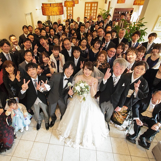 1月の真冬に開催の式だったこともあり、ガーデンでのフラワーシャワーや集合写真撮影はゲストの方々寒いかもな、、、という心配をしていた所プランナーの方から「チャペルでもフラワーシャワー出来ますよ!」「もしかしたらラウンジでも記念撮影できるかも!」とご提案くださり、90人の大人数でもゲストの方々に寒い思いをさせずにフラワーシャワーで祝福して頂き、素敵な集合写真を撮ることが出来ました。