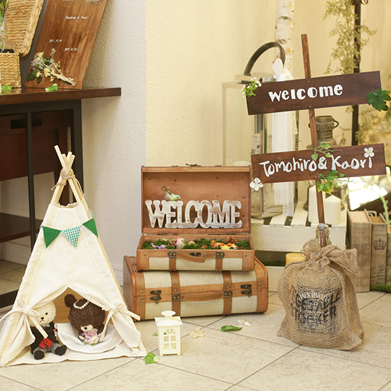 会場や受付の飾りなどもフェスのガーデンをイメージしてDIYの小物で森の中の雰囲気を出しました。