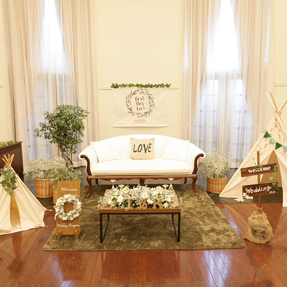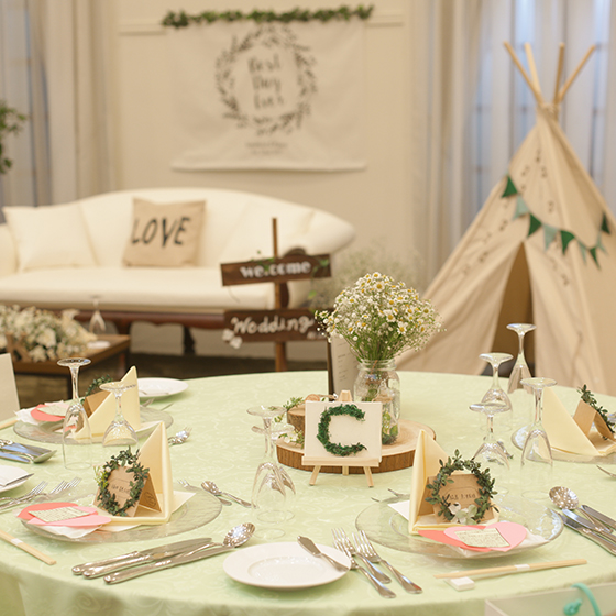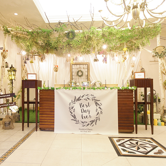 1番こだわった高砂席も森のフェスの雰囲気を出したかったので、小物や使用するお花など、とてもこだわりました。