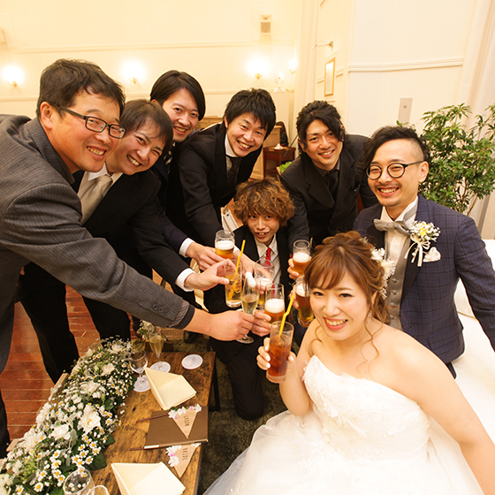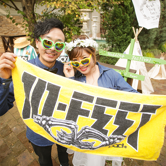 二人とも音楽フェスが大好きで結婚式もフェスのガーデンの雰囲気を出したかったので、挙式も披露宴もフェスの盛り上がる曲を使用して周りの方に掛け声もお願いしたりして会場一体感のフェス風にしました。