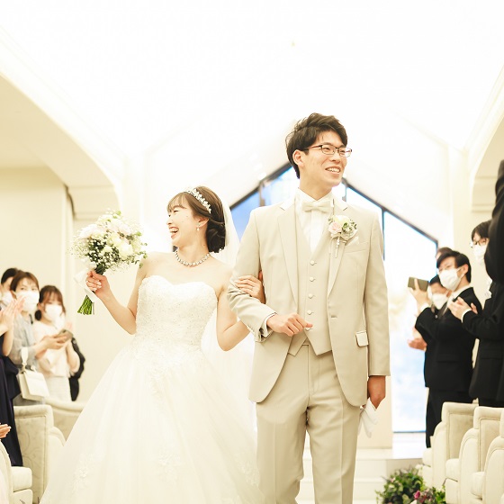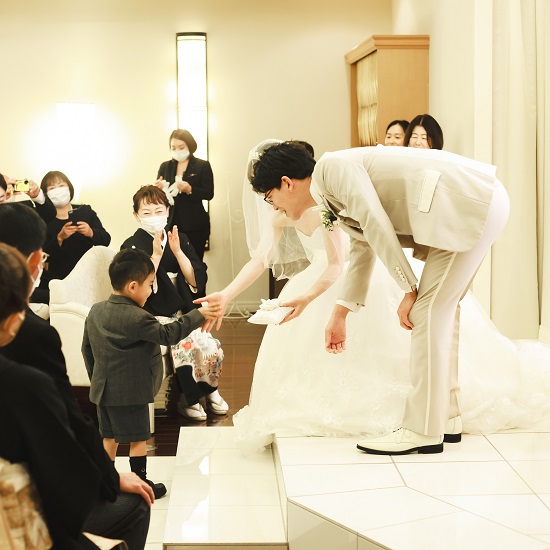 挙式前の会場で、両親との対面式があったり、家族専用の待合室で家族と一緒にゆったりとくつろげる時間がとれたりして、緊張がほぐれました。始まってしまうと家族と話す時間もなかったので、この時間が取れたのは貴重だと思います。挙式会場は小さいですが、その分一人一人の顔が見えて、とても温かい空間でした。