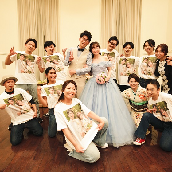 友人同士も久々に集まるので、ゲストの方に楽しんでもらいたいという思いがありました。自分たちのことや、お互いの友人たちの温かさが伝わるアットホームなパーティーになるよう心がけました。お互いの友人に紹介するという意味もこめて、オープニングムービーに簡単なプロフィールも入れて、手作りで動画を作りました。私たちらしいものを取り入れたくて、卓球のラケットを使ったファーストバイト、サンクスバイト、ピンポン玉でのドレス当て、友人たちと一緒に余興のダンスなどをしました。幼児や乳児連れのゲストも多かったのですが、子どもたちにも式の進行を手伝ってもらったり、ハロウィンのお菓子をプレゼントしたりしました。参加するゲストの方に作り上げていただくパーティーになって、とても一体感がありました。