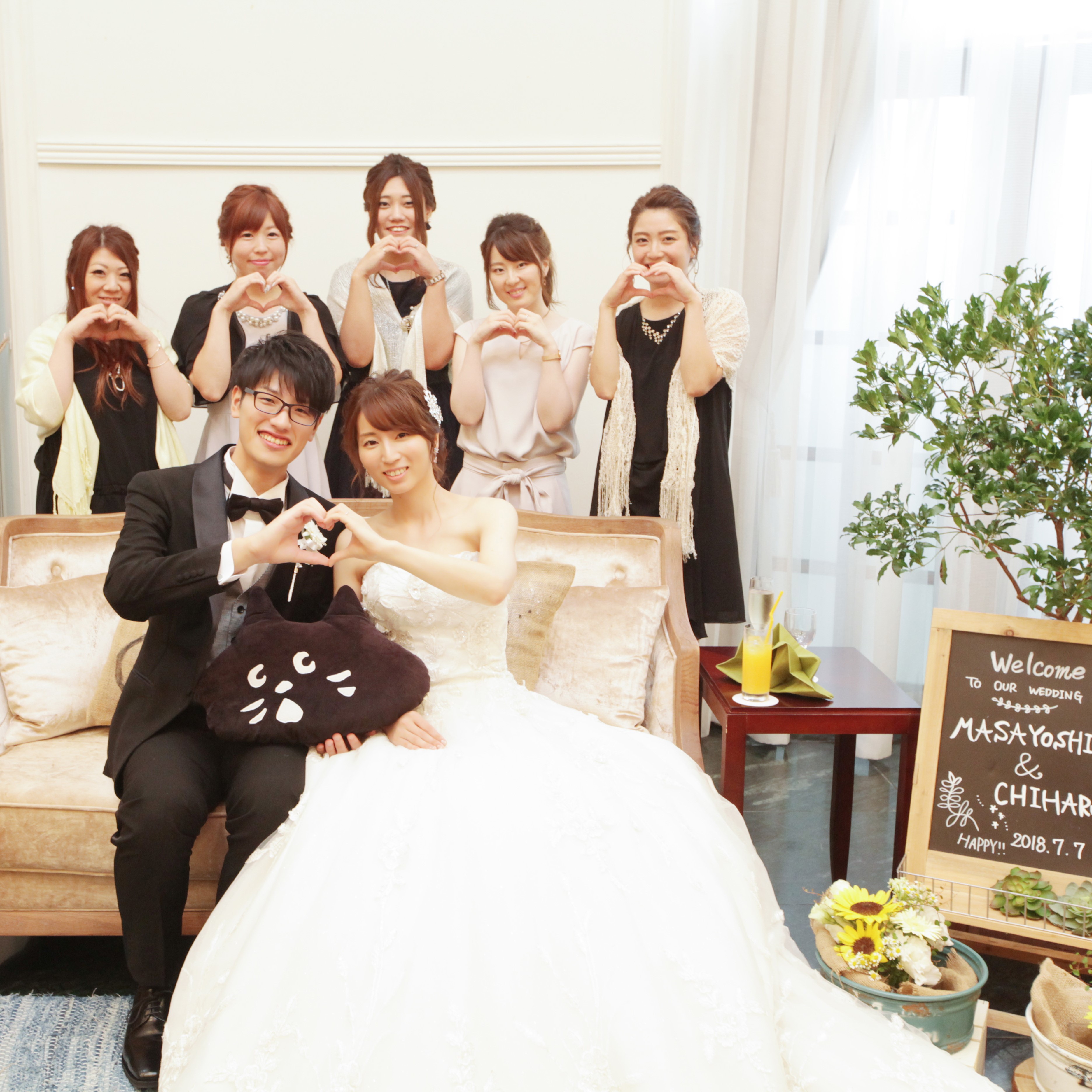 披露宴ではスピーチや余興をなくし、ゲストとたくさん写真を撮ったり話ができる時間を作りました。高砂席も私の希望だったソファ席にし、ゲストとの距離を近く。そして中座する際のエスコート役には、それぞれ大切な友人にお願いしました。