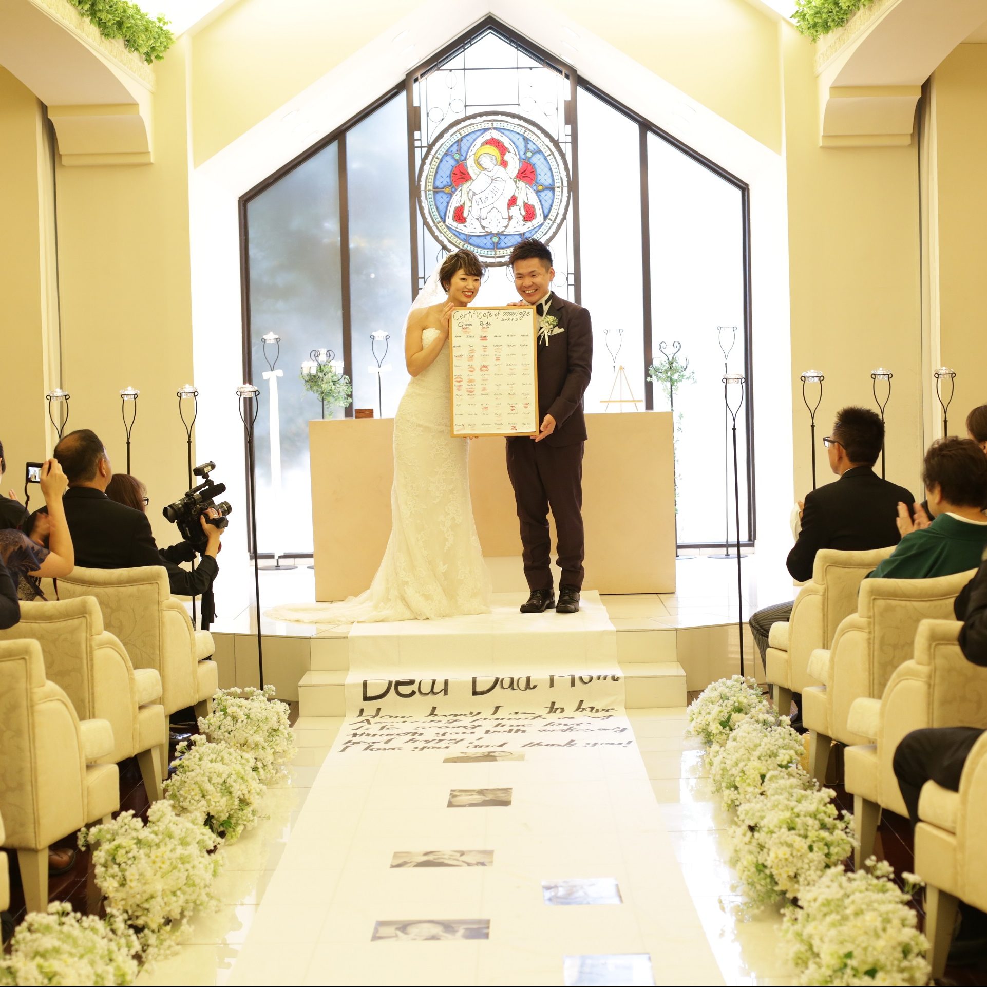 ザ・結婚式 のような、ゴージャスな式にしたくなかったので、テーマはラスティックパーティーにしました。人前式にして、『新婦が鬼嫁になっても、変わらず愛し続けることを誓います』『新郎よりイケメンがいても、見ないようにします』など、自分達のオリジナルの言葉でゲストに誓いました。結婚証明書は、事前に受付に置いておき、ゲストにキスマークを貰い、それを承認のサインとしました。自分達も人前式で、代表の人に口紅を塗ってもらい、証明書にキスマークをして、結婚のサインとしました。世界でたった一つのオリジナルの結婚証明書が出来ました。
