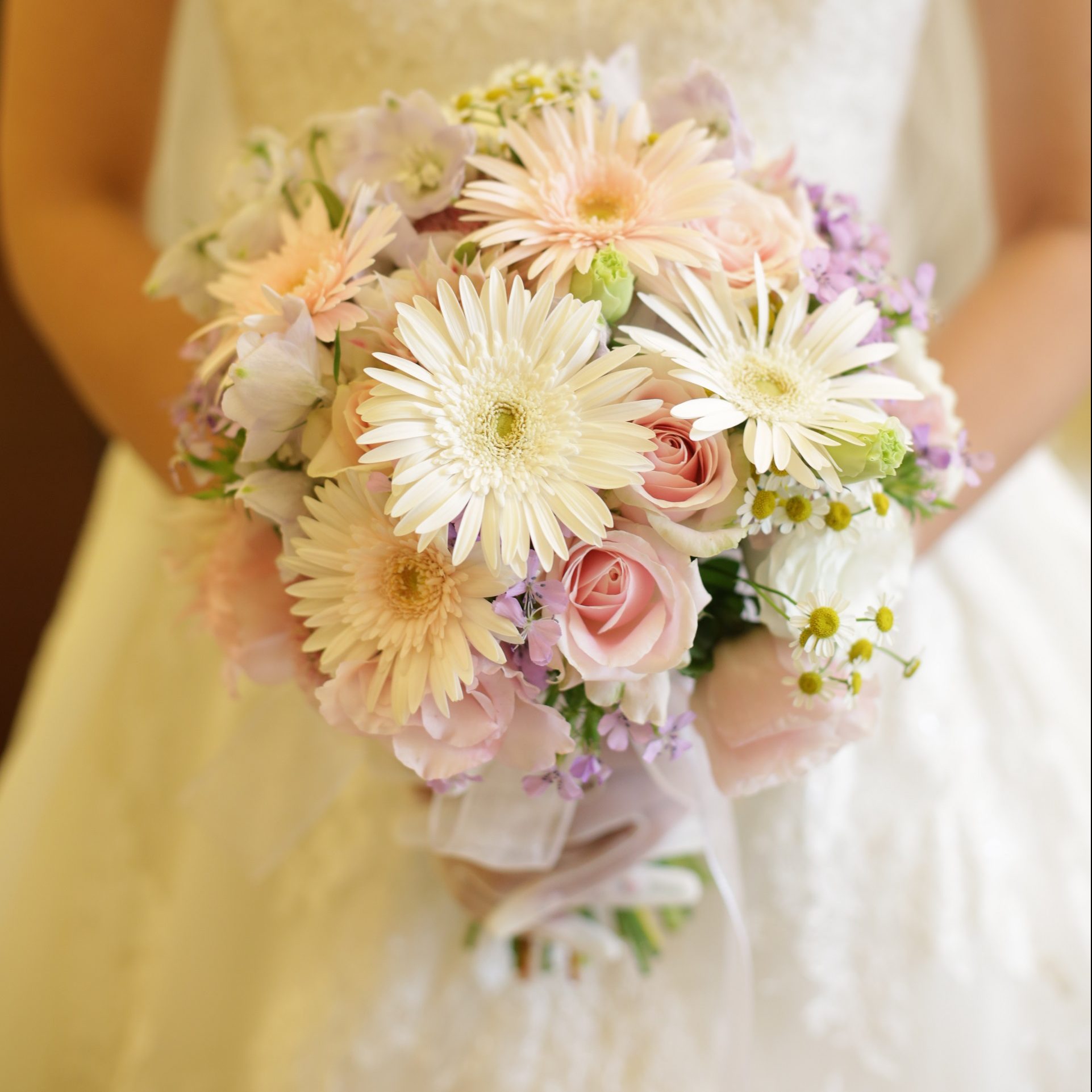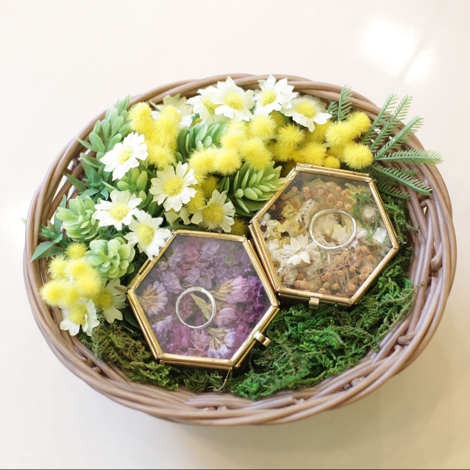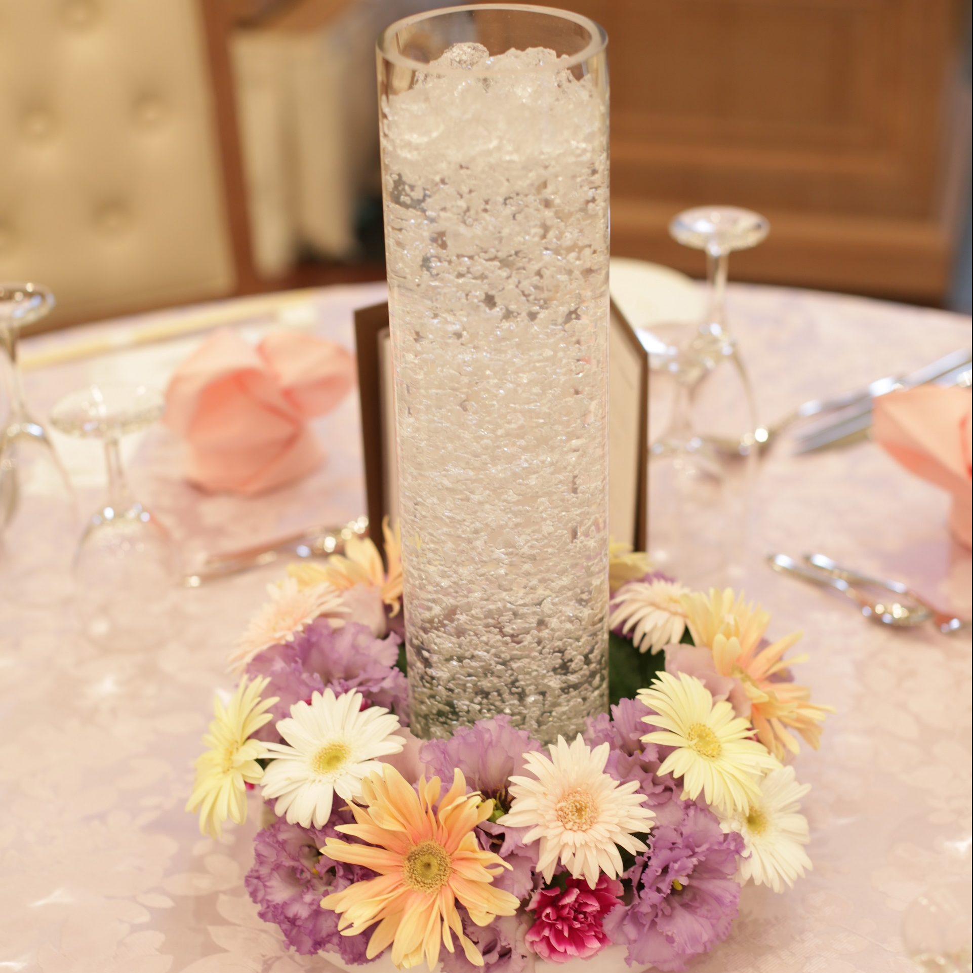 新婦のこだわりであるお花では、ゲストテーブルの生花はゲストが持ち帰った後の事を考えてリース型をお願いしました。色合い、形、全てが可愛かったです。