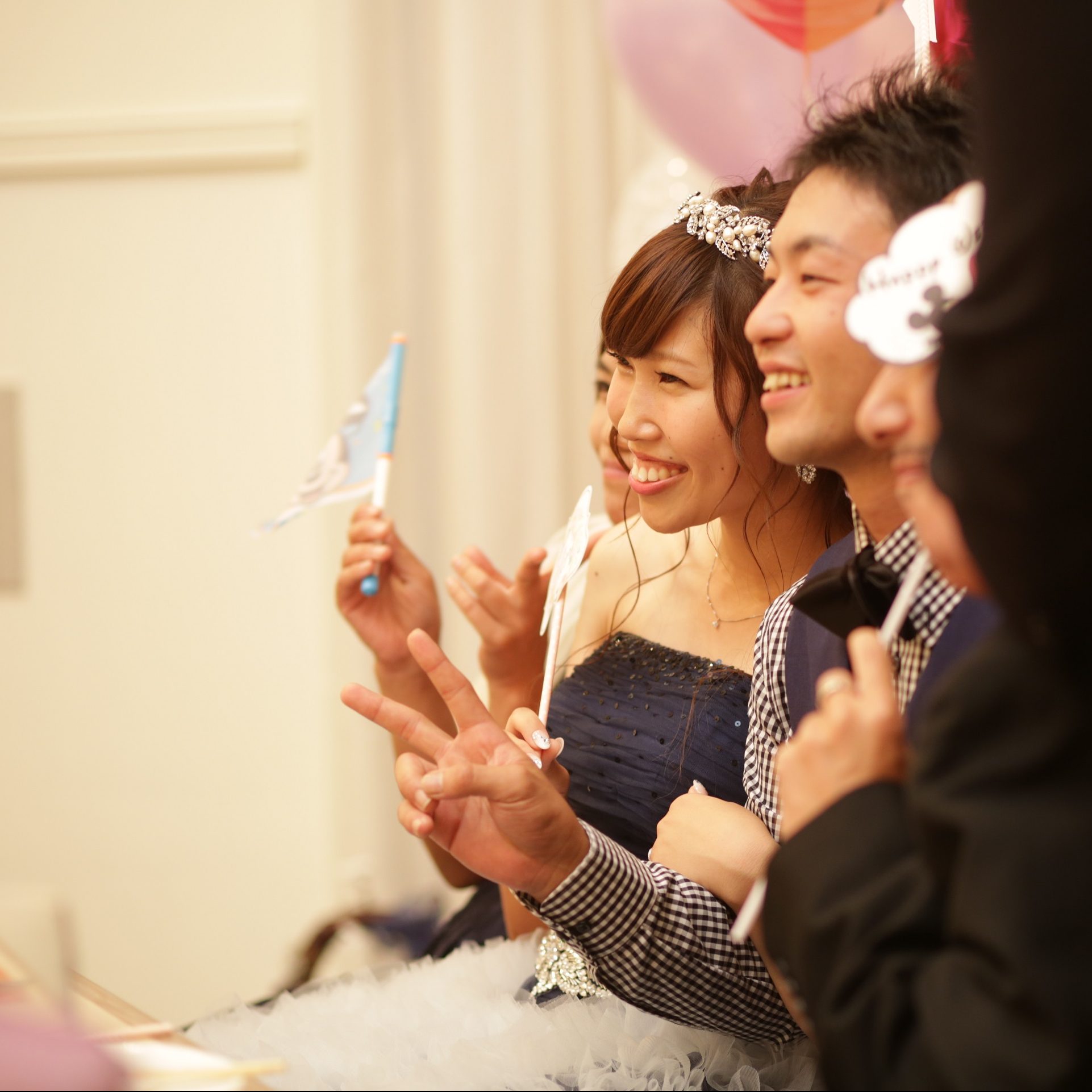 披露宴での再入場では、ゲストにサイリウムを振っていただき、新婦のドレス色当てクイズをしました。大人数ならではの演出でした。まるでライブ会場にいるような空間には私達はもちろんですが、ゲストも大興奮でした。