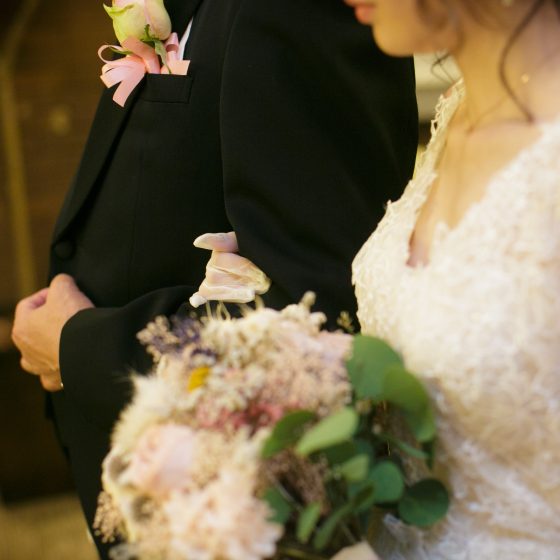 コーディネートはくすみカラーをテーマにドライフラワーをたくさん使用しました。