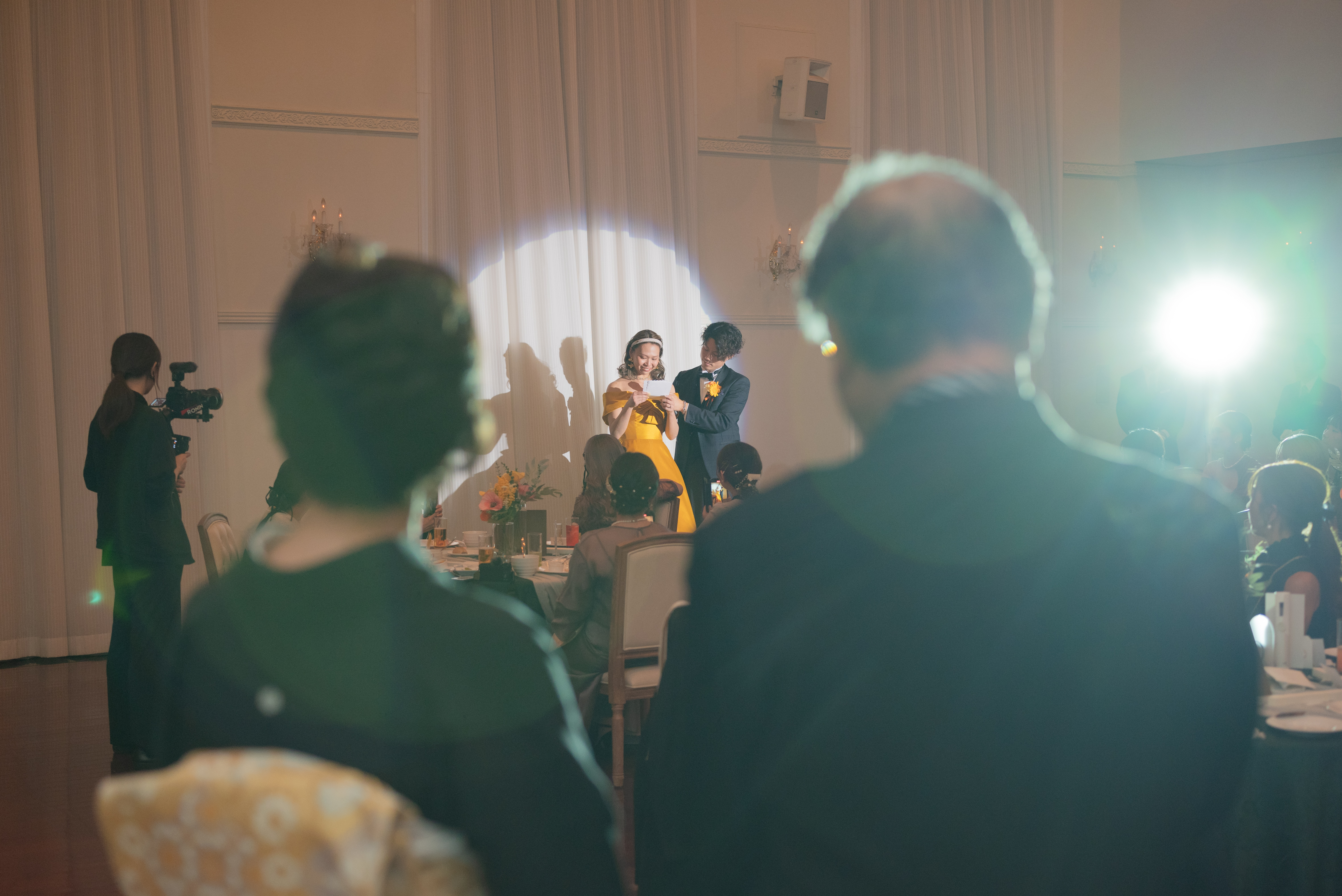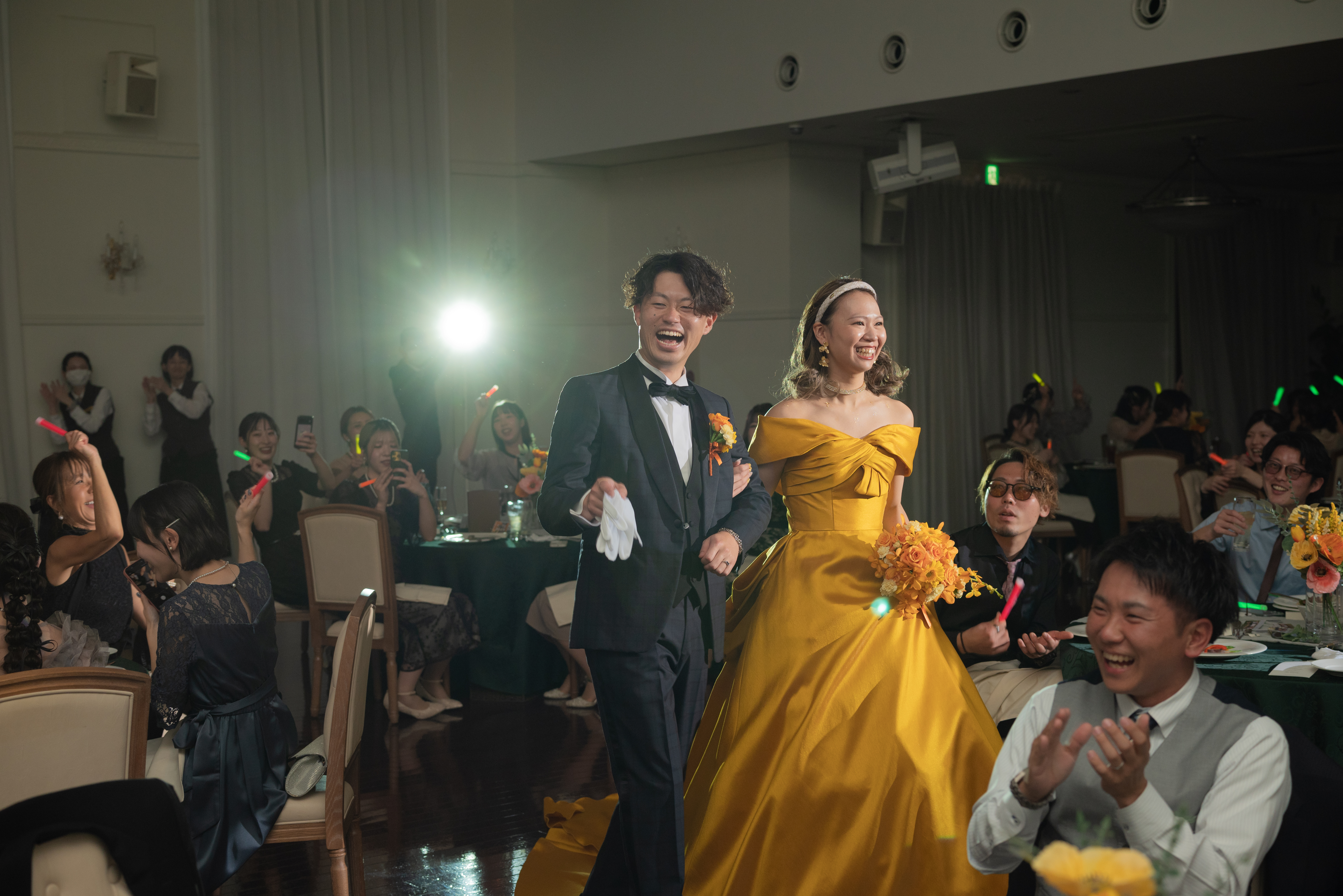 中盤からは、色とりどりのペンライトが揺れる中での再入場や、デザートを片手に「とにかくゲストの近くへ行って話したい、写真を撮りたい」というおふたりの願いを叶える賑やかな時間。