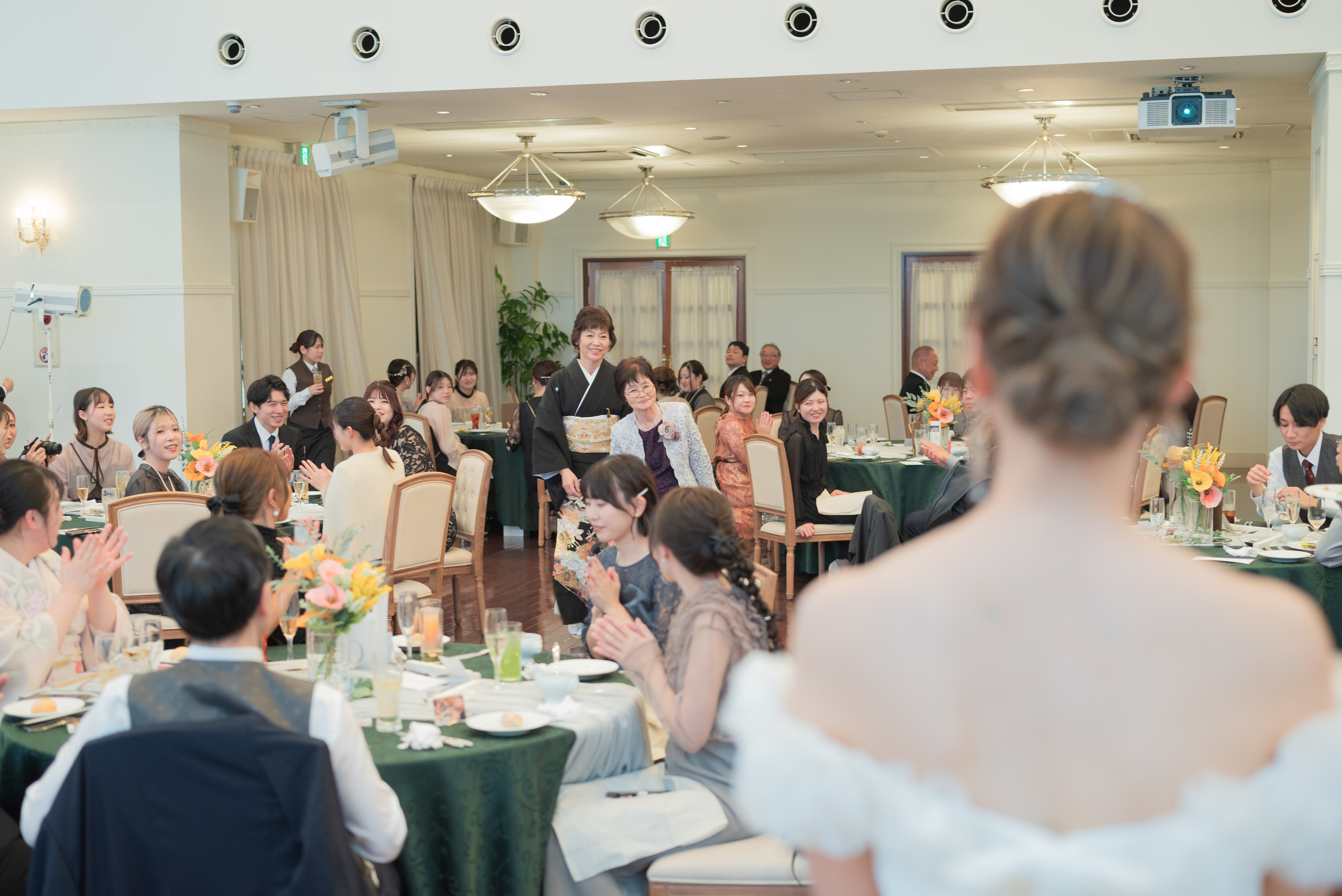 料理、映像、BGMの一つひとつに、ゲストの満足度を第一に考えたおふたりのこだわりが込められました。また、会場スタッフとの連携を重視し、細部まで「抜けのない素晴らしい1日」を目指して準備を積み重ねてこられました。スタイリッシュなホワイトとグリーンのコーディネートには、感謝を届ける日への決意が込められ、最高の一日へと結実していきました。