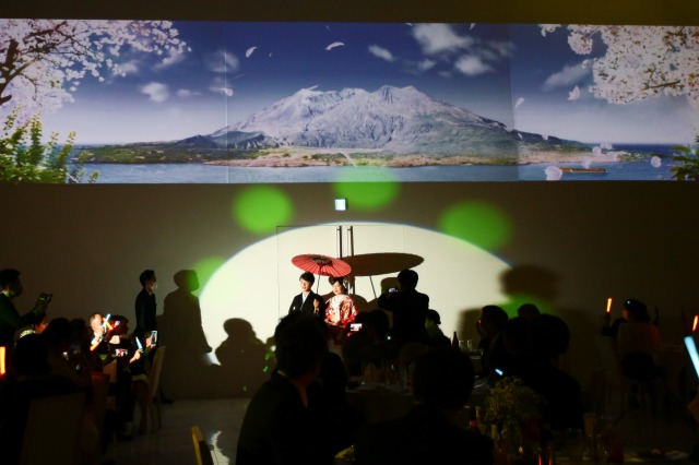 鹿児島らしい美しい桜島の大迫力の演出の中をサプライズ登場!