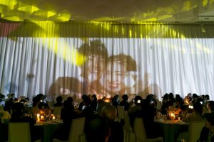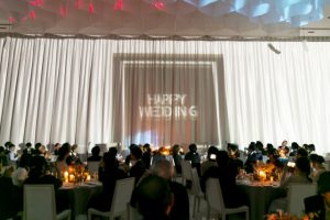 披露宴会場内の大きなカーテンに映し出される