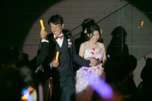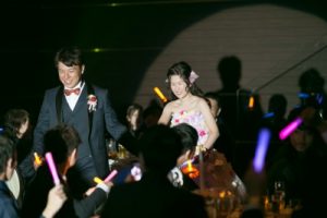 列席いただくお客様に受付時に新婦様のドレス、新郎様の蝶ネクタイの色を予想していただき、その色だと思うペンライトを持って披露宴へ!!
