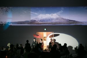 ◆和装ならではの番傘を使って、3面スクリーンには桜島を写しだして会場を素敵に演出