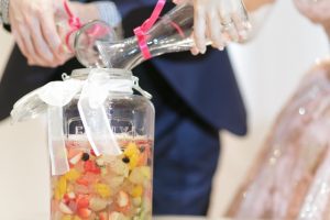 ゲストテーブルにおいてあるフルーツを新郎新婦がジャーに集めていき