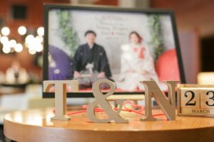 前撮りお写真をウェルカムボードに使いイニシャルウッドと一緒に