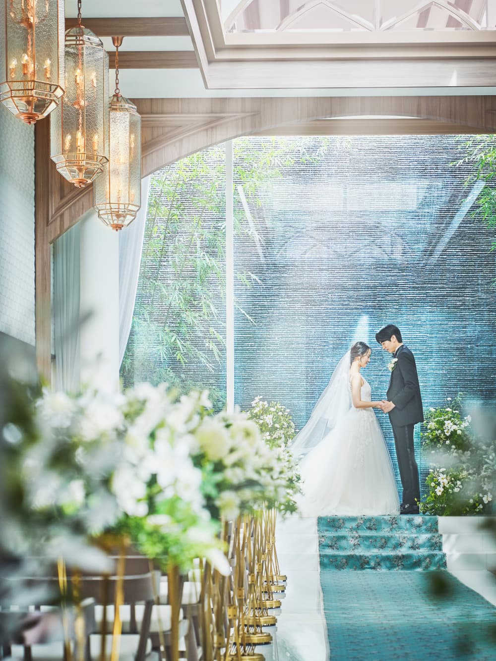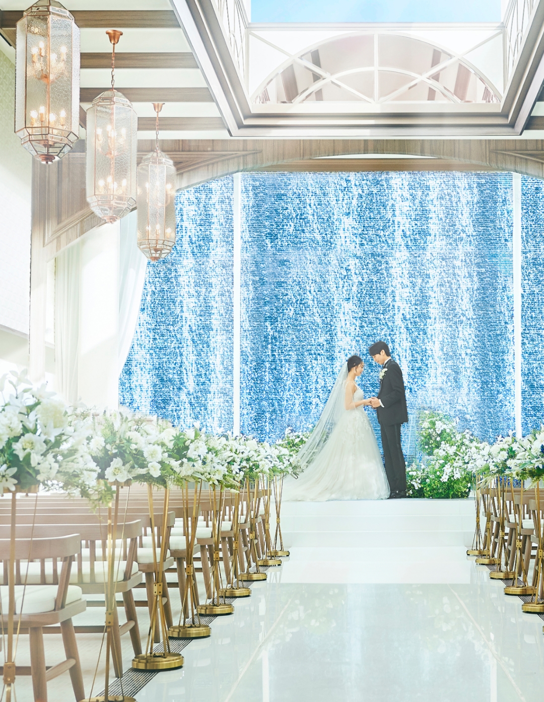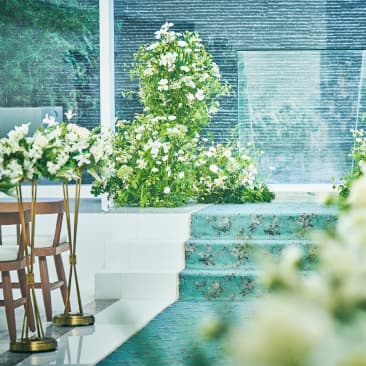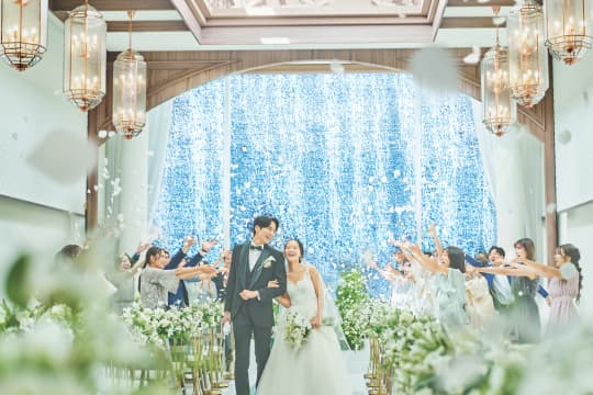 チャペルの扉が開くと、そこは息をのむほど美しい世界。天窓から見える青空と降り注ぐ光、そして祭壇の先に流れる清らかな水が、誓いの空間に特別な彩りを添えます。 洋装も和装も美しく映える、自然と調和した雰囲気の中デドラマチックなセレモニーを叶えていただけます。