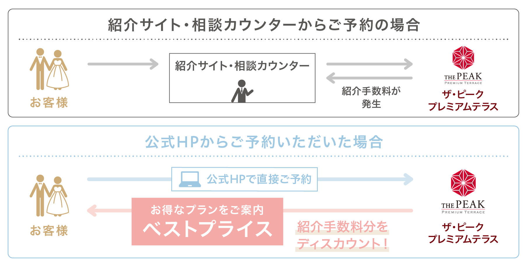 式場紹介・相談カウンターからのご予約や式場比較サイトからのご予約に比べて、当公式HPでご予約いただくと仲介手数料がかからないため、お客様に100%還元したプランをご案内することができます。