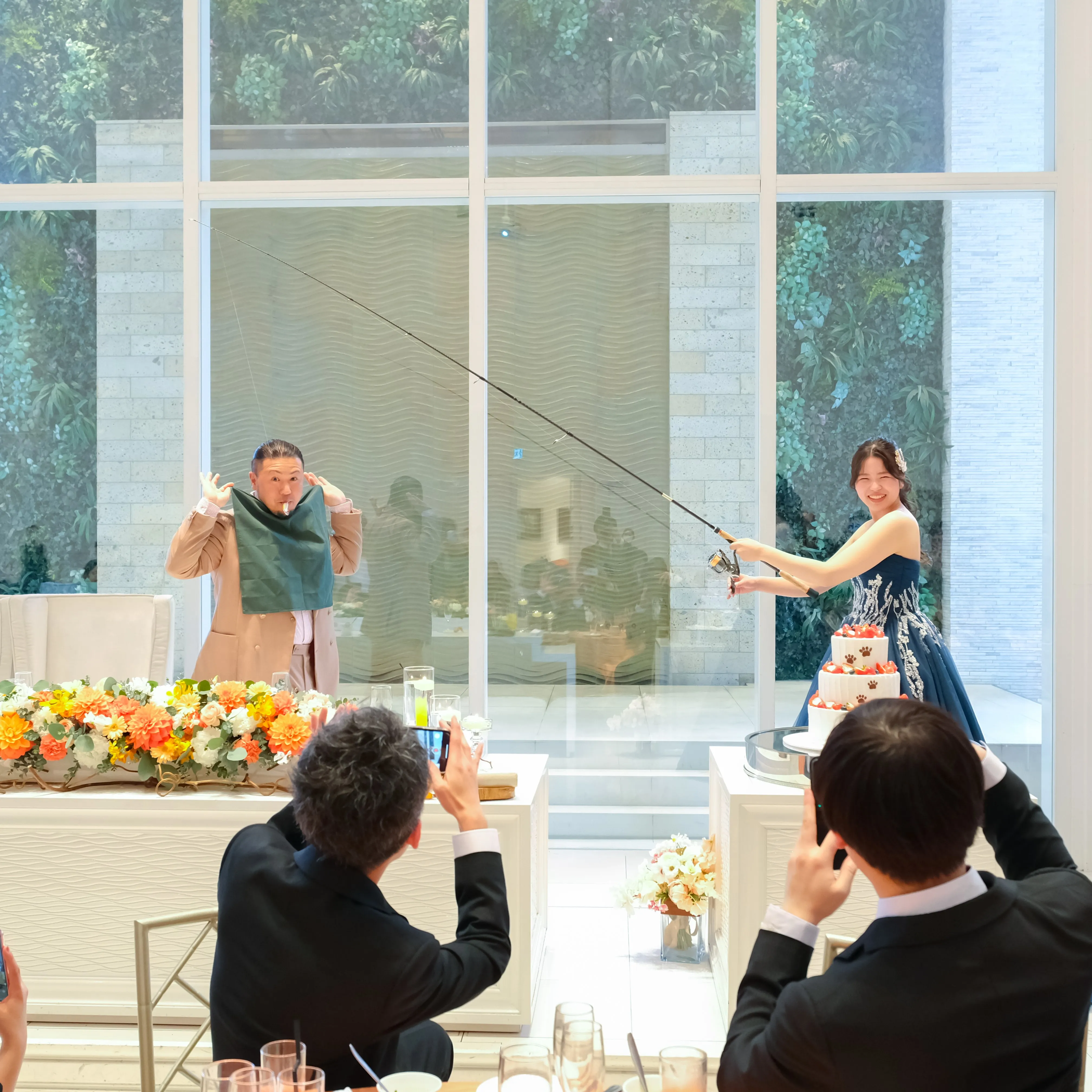 オールドスクールがテーマだったので、BGMを特にこだわりました。新郎セレクトで、持ち込んだCDはタワーになるほど…笑 披露宴入場は映画の挿入曲だったため、カーテンモーションは元々の映画のような雰囲気で作ってくださったり、エンディングムービーも映画風で大満足です。テーマに合わせて装花もテーブルクロスも大好きなオレンジにしました。合わせる花も微妙なニュアンスを汲んでくださり、当日は素敵な装花でした。 挙式ではフラワーガールと参列してくださった方にもフラワーシャワーをしてもらいました。鮮やかなフラワーが空間を彩り、やってよかったと思いました。 友人代表スピーチは、お願いしたゲストが緊張で楽しめないだろうと、サプライズインタビューにしました。各3人ずつでしたが、しっかり話してくれて盛り上がって良かったです。 あとは、ケーキバイト! 新郎が釣りをするので、釣竿でファーストバイトをしました。歓声があがってよかったです。