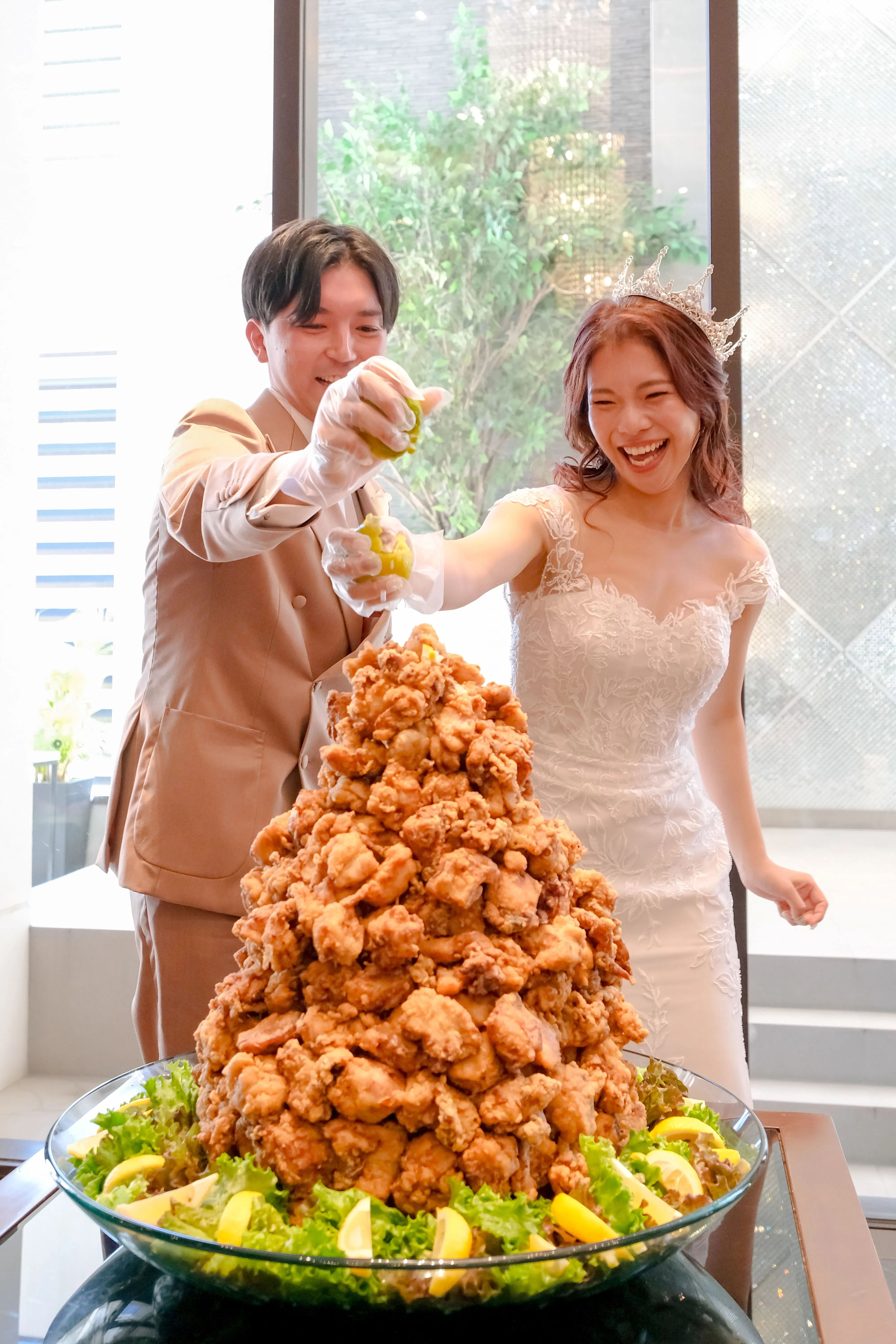 オリジナルの結婚式を作ることが出来るので色々と考えてこだわりましたが… 1番こだわったことはウェディングケーキを唐揚げタワーにしたことです!皆さんの前であまーいケーキをたべさせあうのが何だか私たちらしくないなぁと思い…みんなが好きで楽しめるもの〜??!「唐揚げ!!!!」ということで決めました。新婦が筋トレが趣味であることもあり、なかやまきんに君さんのお決まりの「やー!」でレモンを絞り、会場も盛り上がりました。味も美味しくてゲストの皆様にも大好評でした☆