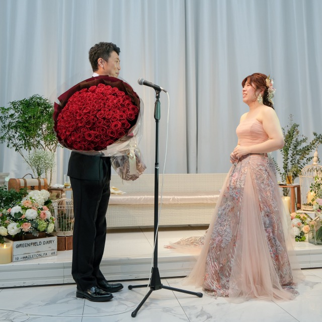 また,最後に彼からは愛を込めたこれまで見たことのない100本のバラの花束とムービーのサプライズをいただき,準備していることを全く気付けなかったので驚きが隠せませんでした。招待が叶わなかった方もおりますが,ゲストの皆さんと直接お会いし,直接お祝いのお言葉をいただき,たくさん方々に囲まれ結婚式披露宴を行うことができて良かったです。結婚式披露宴の開催をあきらめず,感染対策を徹底してみなさんと楽しい時間を過ごすことができて感謝しております。