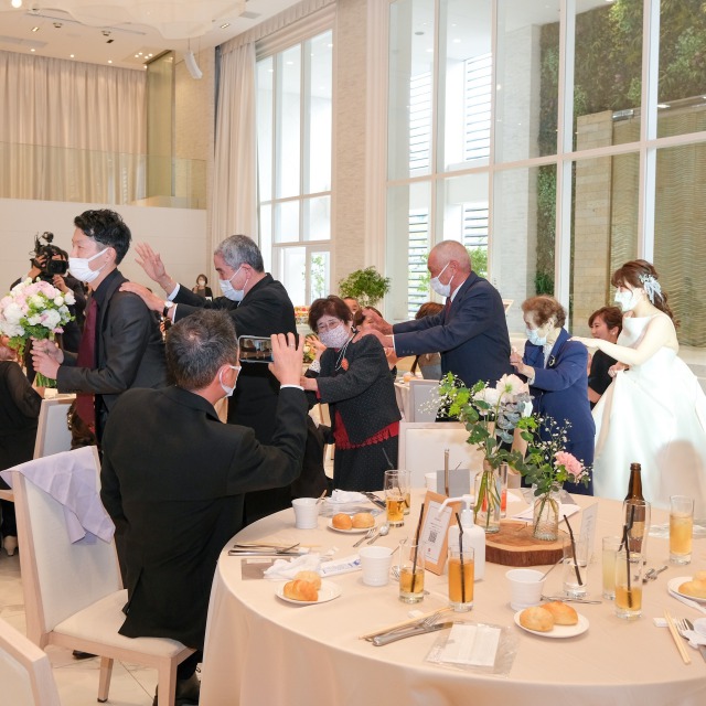 コロナ渦での結婚式披露宴となり,自分たちの身勝手で皆さんにご迷惑をおかけしているのではないかと,準備中は不安がたくさんありました。 周りの方々からの「楽しみにしているよ」「万全に感染対策,体調管理して出席するよ」との励ましの言葉で準備を前へ進めることができました。県外のゲストはほとんど招待できませんでしたが,出席できなかった親族友人に実弟や親戚の協力を得てインスタグラムやラインのライブ配信によってリアルタイムで私たちの晴れの姿を見ていただけることもできました。