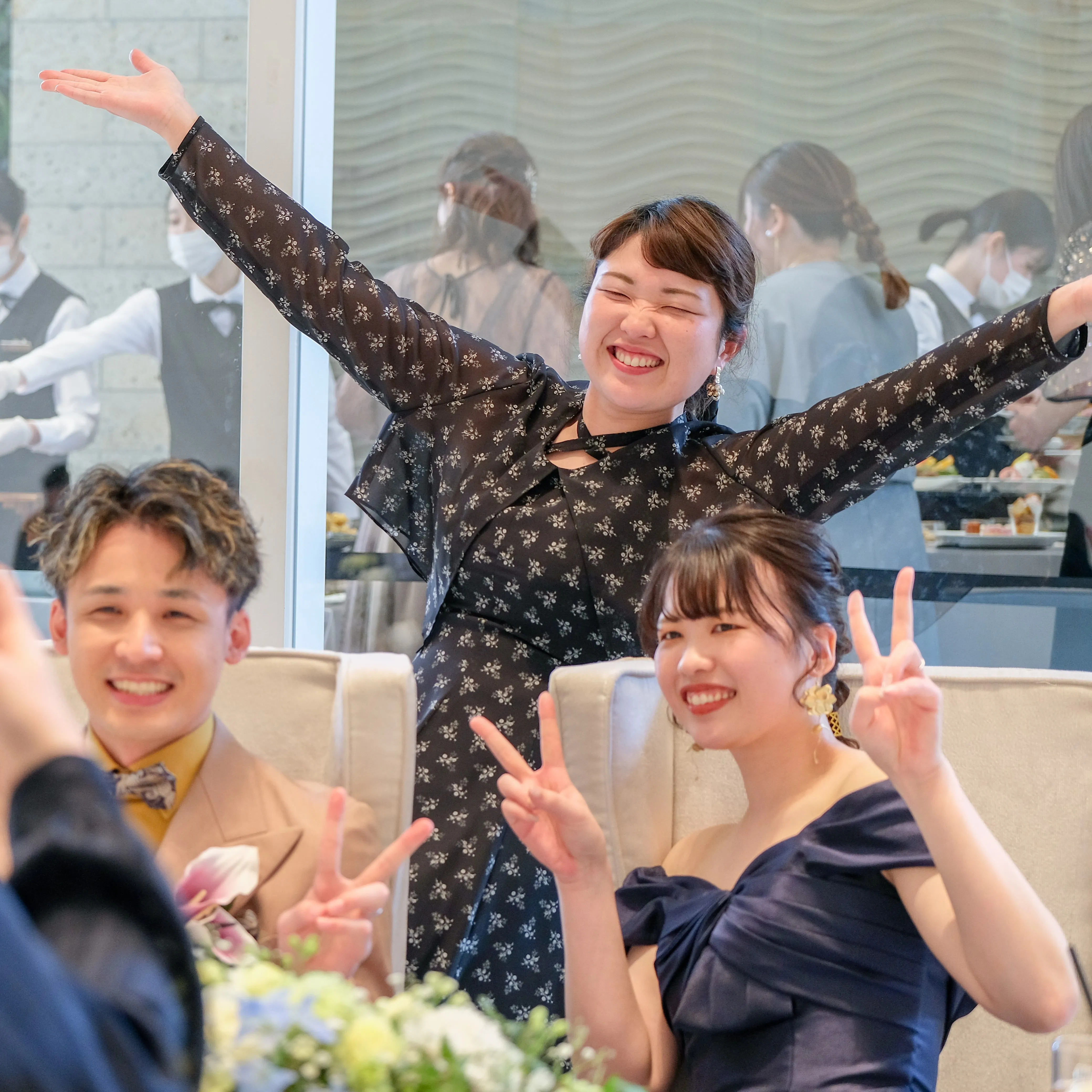 とにかく、たくさん飲んで!食べて!私たちや来てくれている方々同士でもおしゃべりを楽しんでもらいたい!と思っていたので、挙式が終わるとすぐにラウンジで飲み始めてもらいました。コスメブーケトスやカップラーメントスをする時間も参加したいゲストは参加して、飲みたいゲストはラウンジでそれぞれ飲んでいて、写真を撮りに各々来てくれて、あの時間すごくよかったよ!と親族や友達にも言ってもらえました。 たくさん飲むならたくさん食べたいよね?!ということで、ビュッフェも取り入れました。私達の要望を全てシェフが叶えてくれて大大大好評で、私たちもとっても嬉しかったです! また、どうしても感謝を伝えたい友人がいることをプロデューサーさんに伝えると挙式の始まる前に、両親、親族時間とは別に友人との時間を作ってくれて友人にもファーストミートすることができました!友人もとっても喜んでくれて素敵な時間を頂き感謝しています。
