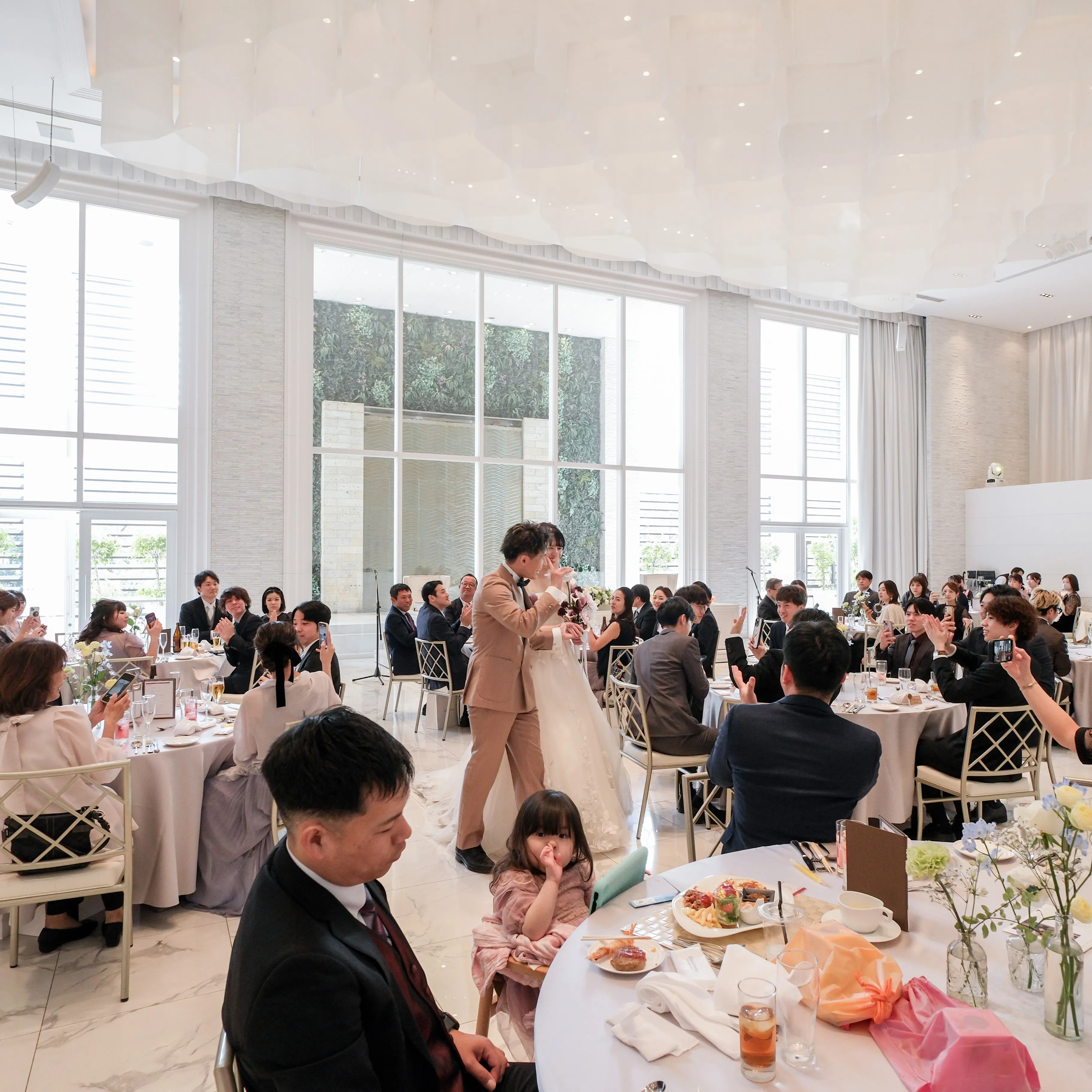 みなさんおっしゃっていますが、本当に一瞬でした!!!!! ヘアメイクや着付けをしている時から、プロデューサーさんを始め、メイクさん、カメラマンさんにも可愛い、カッコいいと言ってもらって気持ちが高ぶる中、挙式が始まり、気がつけば中座の時間でした。衣装チェンジして、BGM当てクイズを行いビュッフェのお披露目!3回目だよ〜って、ビュッフェを取りに行くゲストだらけでした。その間に思っていた以上に高砂に写真を撮りにきたり、お酒を注ぎに来てくれて、来てくれた皆んなと目を見てお話しする事ができました。また、ゲスト皆んな口を揃えて、"テーブルに付いてくれたスタッフさんの対応すごく良かった!"っと言っていました。私たちもすごく嬉しかったです! "ゲスト皆んなが楽しめるナチュラル結婚式"を叶えてくださって、プロデューサーさんを始め、携わってくださった皆さま、本当にありがとうございました!!!!!