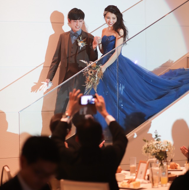 再入場の際は、階段部分のスクリーンが上がった時に新婦だけ立っており、しばらくしてドアが開き新郎が入場。そして新郎が新婦を階段を登り迎えにいくという演出をしました。
