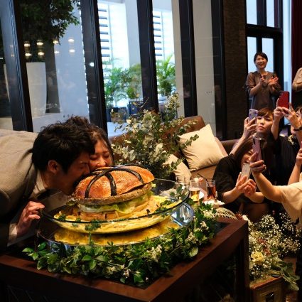 わたし達夫婦はバスケをしているので、ファーストバイトは大きなハンバーガーをバスケットボールに見立てて丸かじり♡