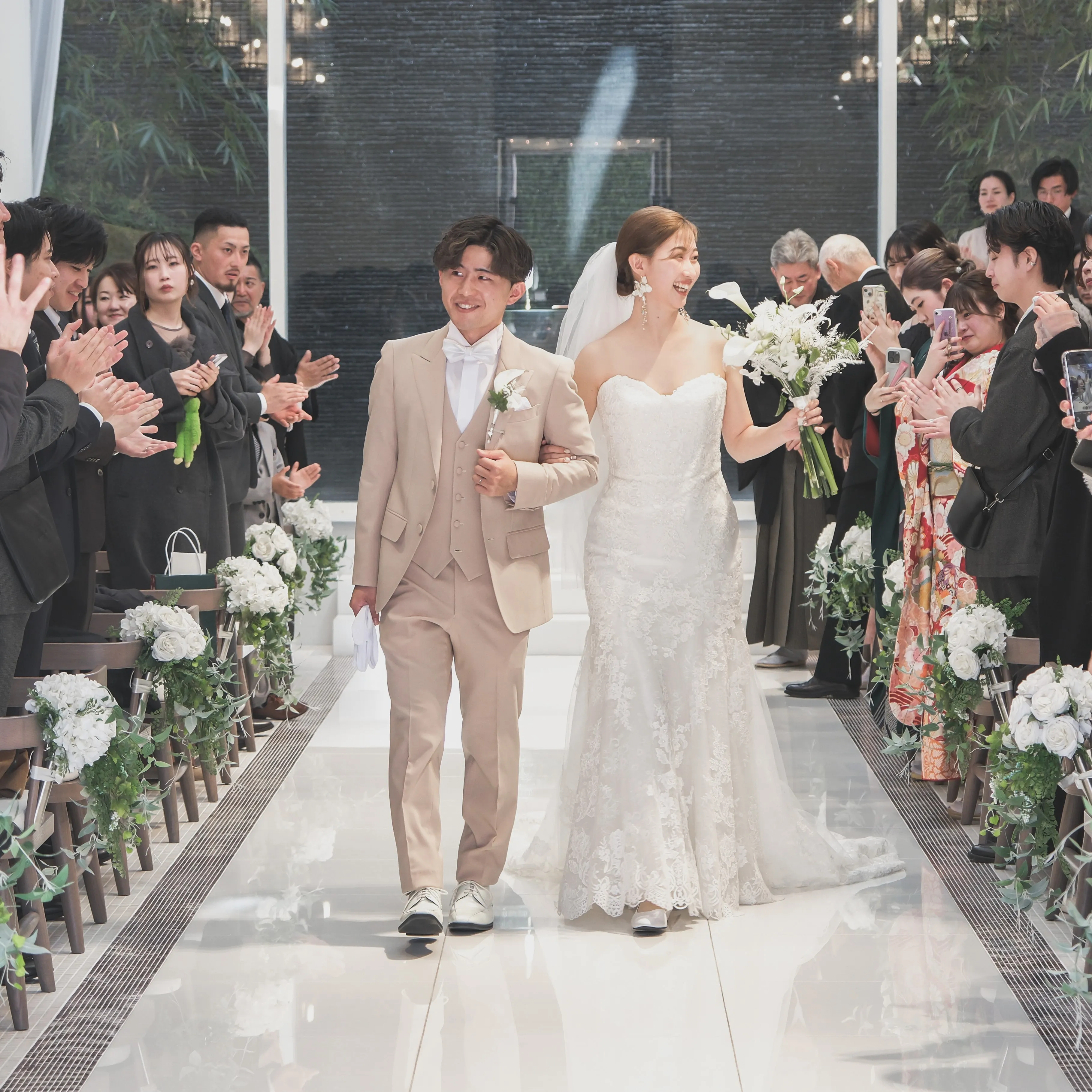 特にこれといったこだわりはありませんでしたが、プロデューサーの方と相談しながら、一つひとつ納得のいく選択をしていきました。最初は具体的なイメージがなかったため、プロデューサーさんが過去の事例や写真を見せながら提案してくださり、その中から自分たちの好みに合うものを選ぶ形で進めました。挙式の演出やケーキのデザイン、ドレスの選び方もアドバイスを参考にしつつ、無理のない範囲で決定。結果的に「自分たちらしい結婚式だった」と多くのゲストから喜ばれ、大満足の1日となりました。