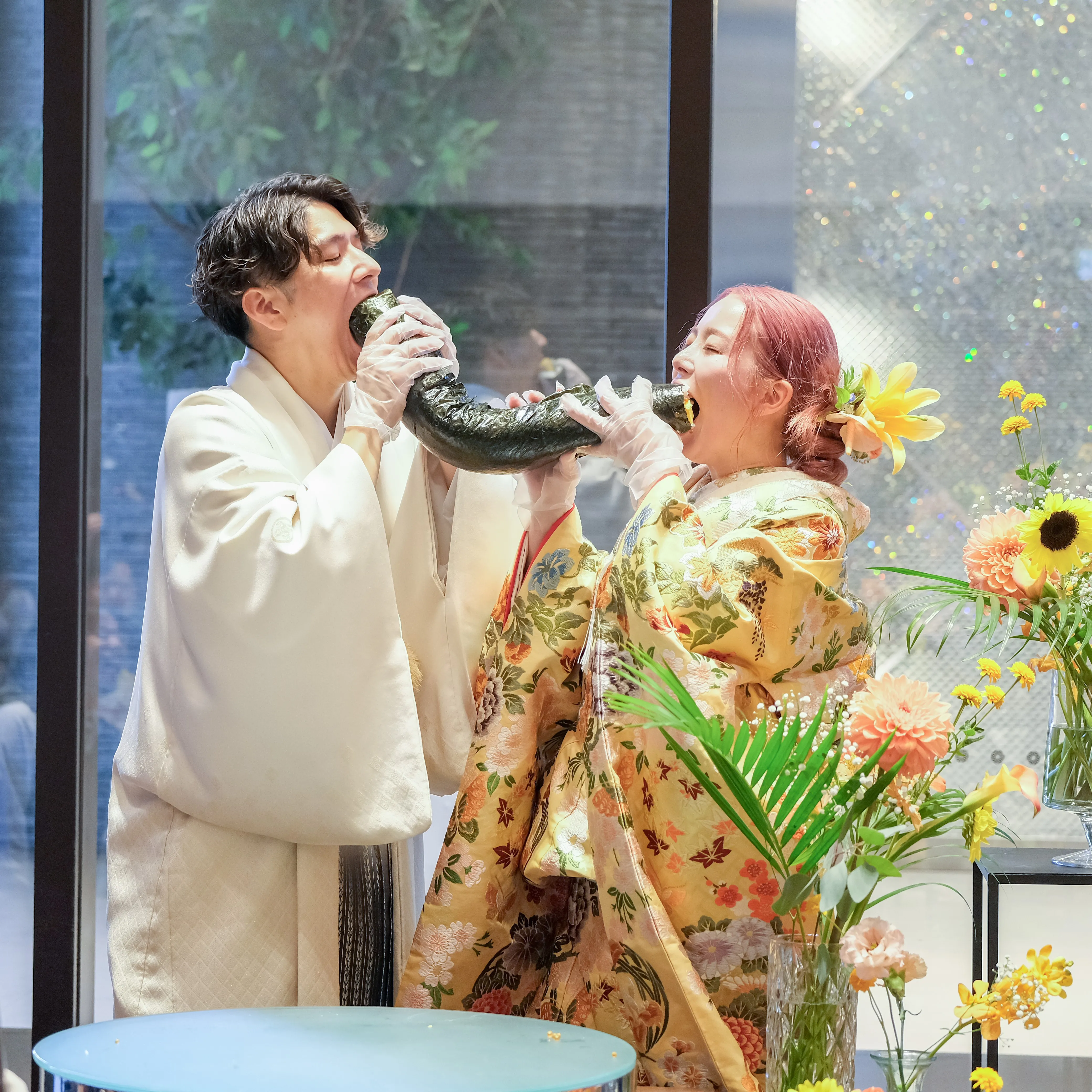 時間設定を設けました。 ケーキ入刀においては、和装だった為、巻き寿司セレモニーを開催!