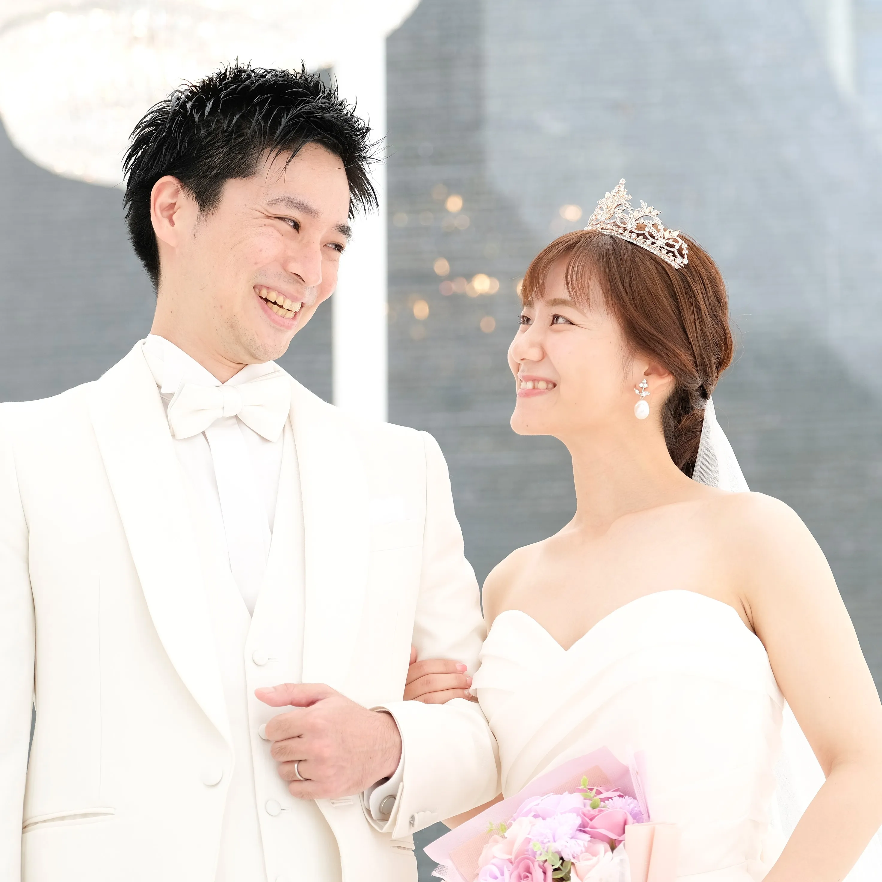 結婚式は絶対白!という思いから新郎新婦2人とも白で身を纏いました。挙式は感動するものという世の中の概念から外れ、スタンダードな流れの中にも笑顔を絶やさないという自分ららしさを意識して、挙式をしました。日頃はくっつくことのない両親との入場は子供のころを思い出す懐かしい 感覚になりました。アフターセレモニーではみんなとの写真の時間にし、お話を万遍なくできたらと思い、深くは話さずとも久しぶりに合うみんなと笑顔を見せ合うことができました♪青空であってほしいという願いからか雨予報の中雲がなくなる時もあり、綺麗な空の下でみんなと過ごすことができました。2人が選びそうな空間だなと思ってるもらえるような時間を過ごすことができたと思います。