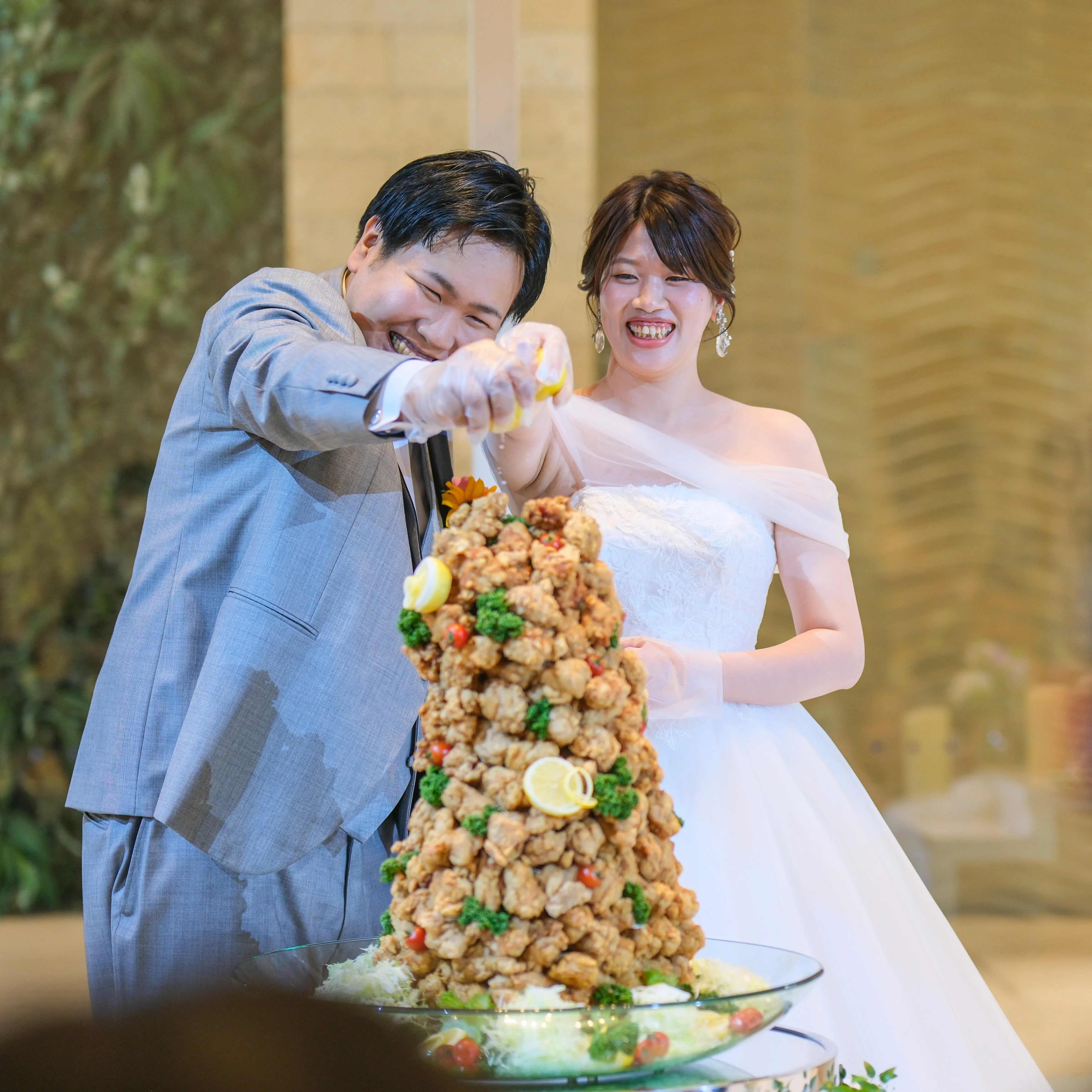 ドレスも含め全てこだわりました! 日頃は赤色が大好きですが、旦那さんのご要望のエメラルドグリーンに^^ 料理は食べるのが大好きな旦那さんが 考えてくれました◎どの料理も美味しくて 最高でした◎唐揚げタワーも大盛り上がりでして大正解でしたー!