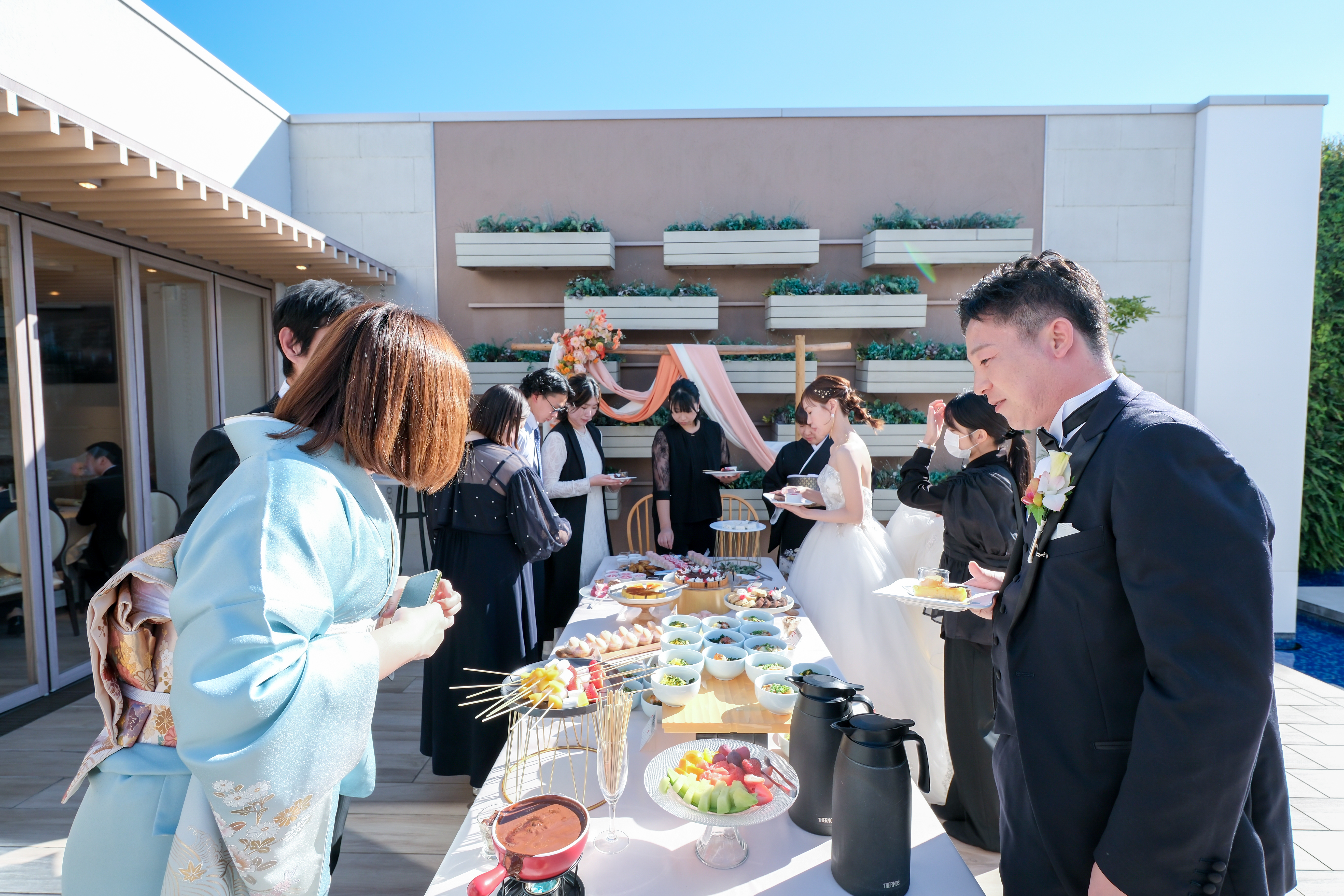 全員に楽しんでもらえるように行った宝くじゲームタイム。3等~1等まで当たりが出るたびに笑い声が溢れ、より和やかの空間に包まれました。ここからまだおふたりのおもてなしは続き、晴天に恵まれたテラスにてデザートブッフェのおもてなし。華やかの空間にさらに笑顔広がりました。