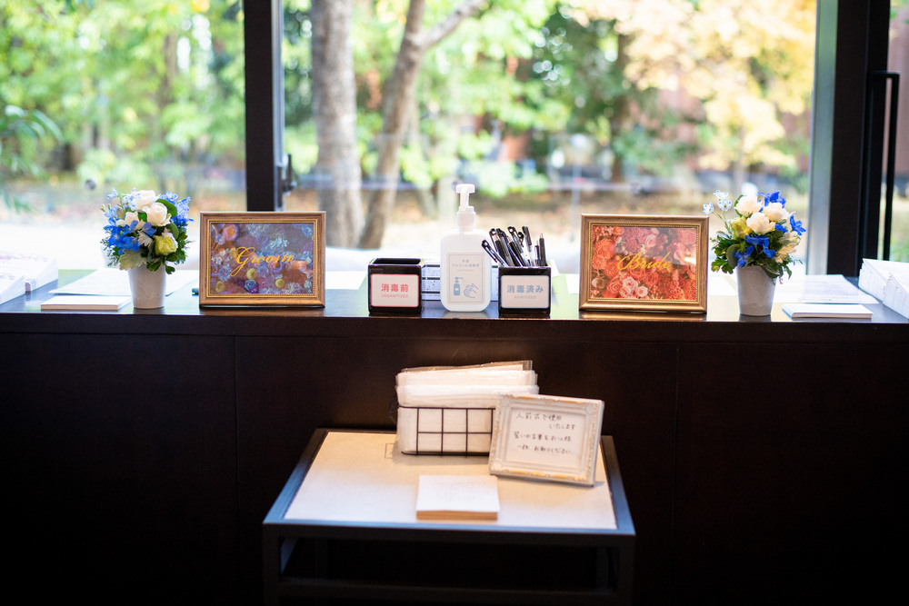 近い時期に式を予定している花嫁たちのインスタは良く見ていていました。けれど、ネットを開くと、コロナ関連のことばかりになってしまうので、なるべくマイナスな投稿は避けて、ウエルカムスペースの飾り付けなどの、テンションが上がる投稿をよく見るようにしていました。そんな中、お打合せの中で、会場側で「アクリル板を用意できる」というのを聞いて、すごく安心しました。