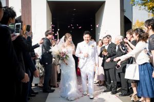 ゲストの方々からの祝福の声やフラワーに包まれてご退場されたり