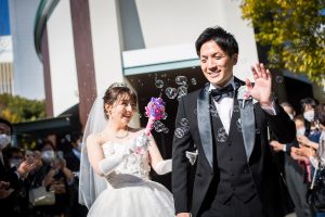 こちらのお写真は新婦様がシャボン玉を飛ばしながらご退場!
