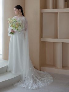 透明感のあるチュールをたっぷりと重ねたドリーミングな1着。