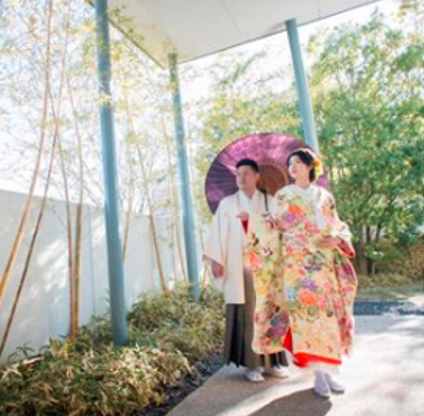 和装でも洋装でも 緑が映える麗風 四季が感じられる会場だからこそ 移り変...