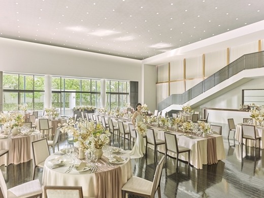 つくばエクスプレス「研究学園駅」から徒歩5分というアクセス便利なロケーションにありながら、一歩足を踏み入れた瞬間、緑と静寂あふれる雰囲気に包まれます。バンケットは150名収容できる圧巻のスケール。見上げるほどの天井高を誇る空間は開放感も抜群、一面の窓の外には緑豊かなプール付のテラスが広がり、階段入場や壁一面を使った映像演出など多彩な演出をお愉しみいただけるのも魅力です。