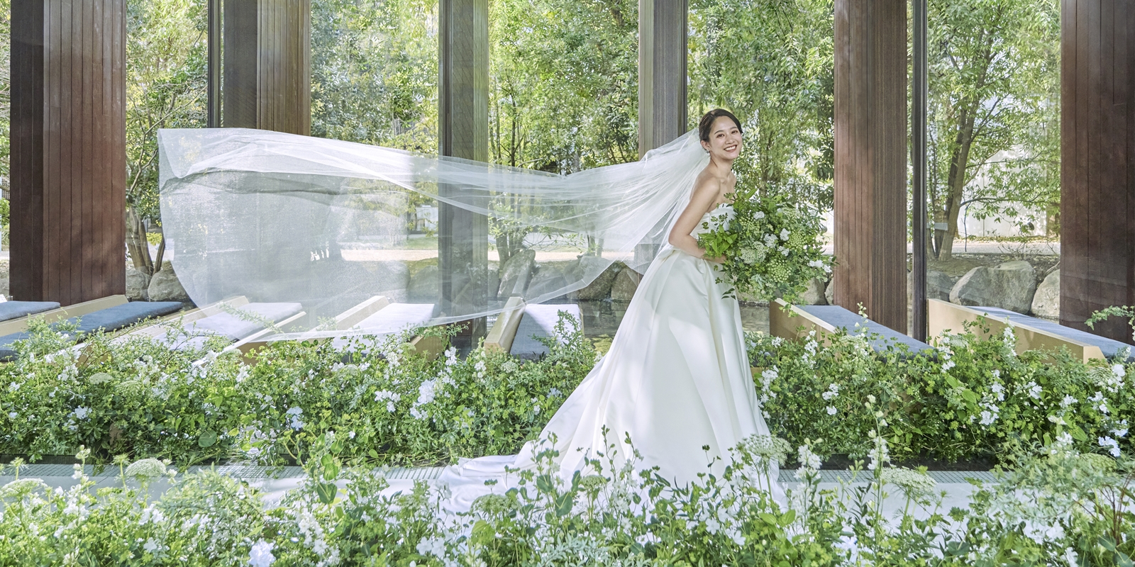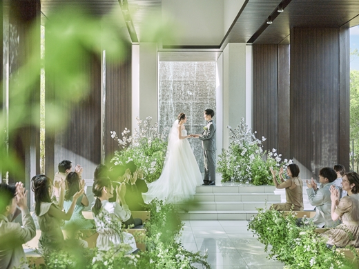 美しい自然と一体化したガラス張りの独立型チャペルは、開放感あふれる誓いのステージ。祭壇の奥には滝の水が流れ、窓の外に広がる緑と陽光にきらめく大理石のバージンロードが、美しく感動的なセレモニーを演出します。洗練された空間では、キリスト教式はもちろん、和装での神前式も執り行っていただけます。