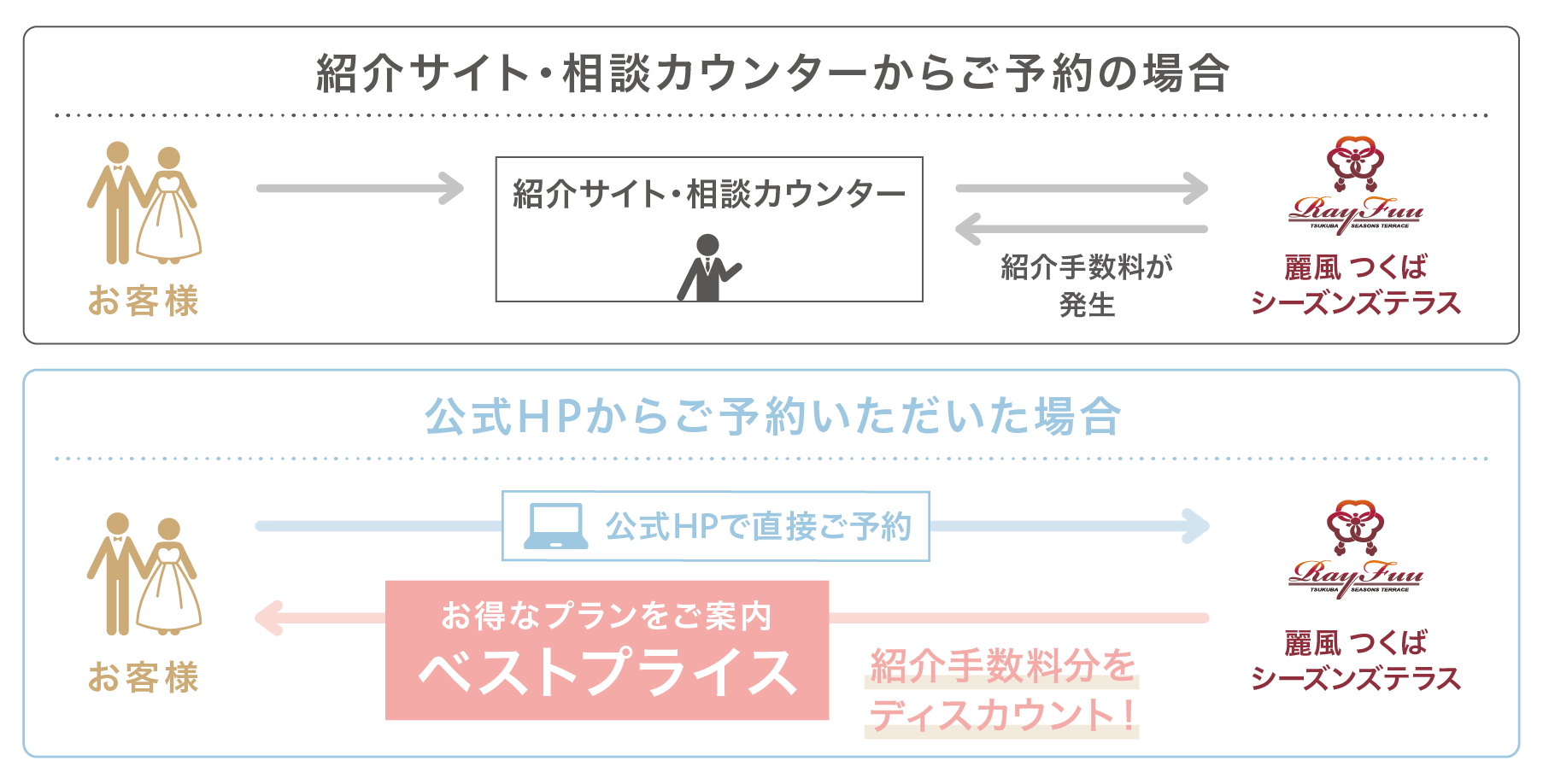 式場紹介・相談カウンターからのご予約や式場比較サイトからのご予約に比べて、当公式HPでご予約いただくと仲介手数料がかからないため、お客様に100%還元したプランをご案内することができます。