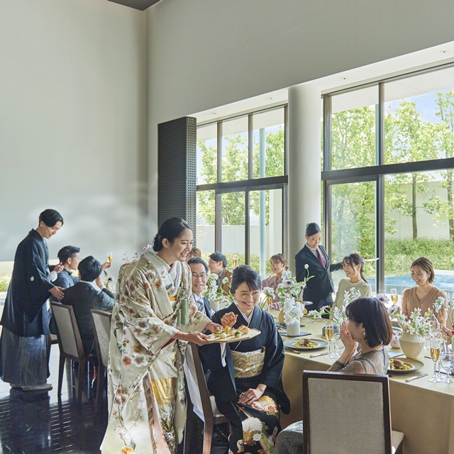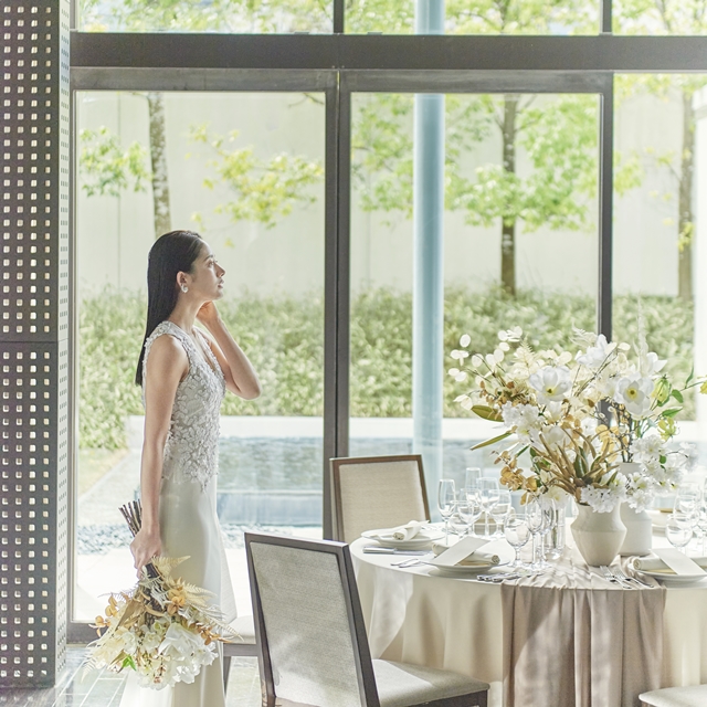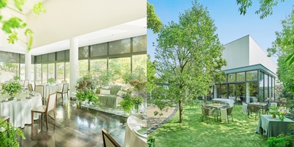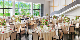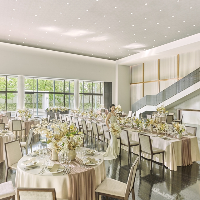 パーティー会場は、天井7mと高く、窓一面から陽光が射し込む開放感あふれる空間です。広々としたガーデンテラスも併設され、自由な演出をお愉しみいただけます。また、パノラマスクリーンやプロジェクションマッピングなど最新映像設備を駆使したドラマチックな演出も可能です。プライベートなパーティーからビジネスシーンまで幅広くご利用いただけます。