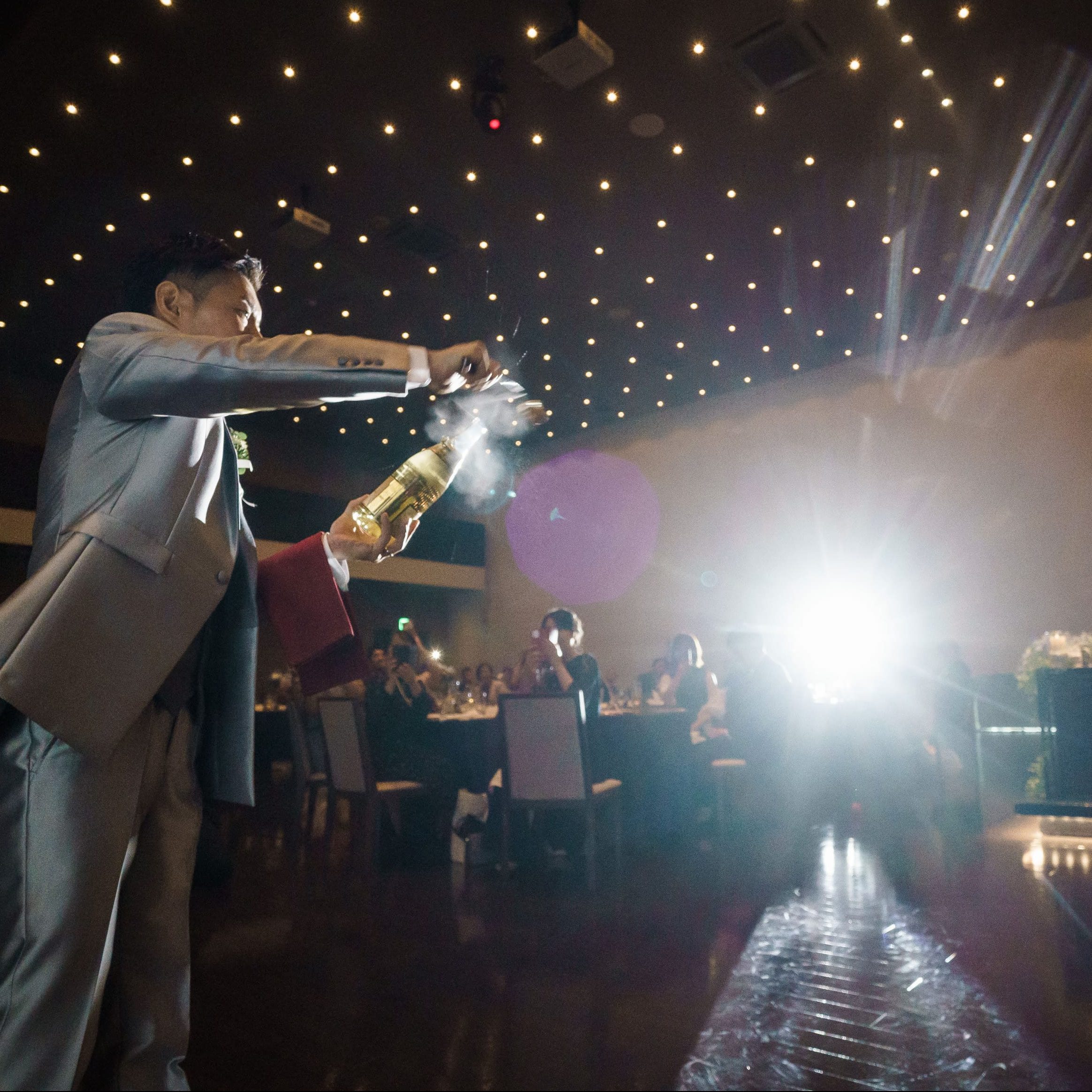 中世フランス海軍が航海の無事と戦いの勝利を願う儀式が由来。現在では、ボトルの口とコルクが一緒に飛んでいくことから結婚式では『一生くっついて離れない』という縁起の良い、華やかな演出のひとつです。