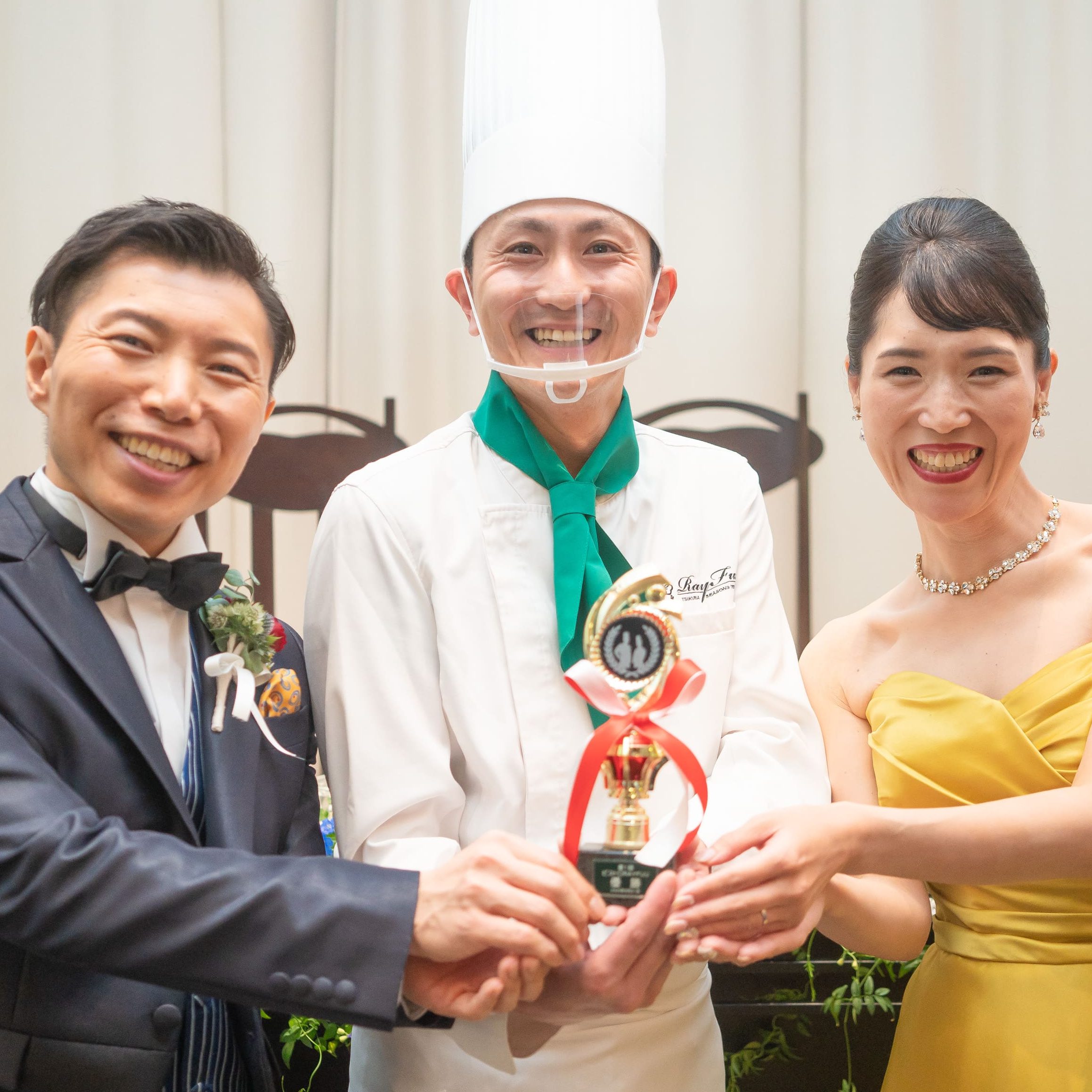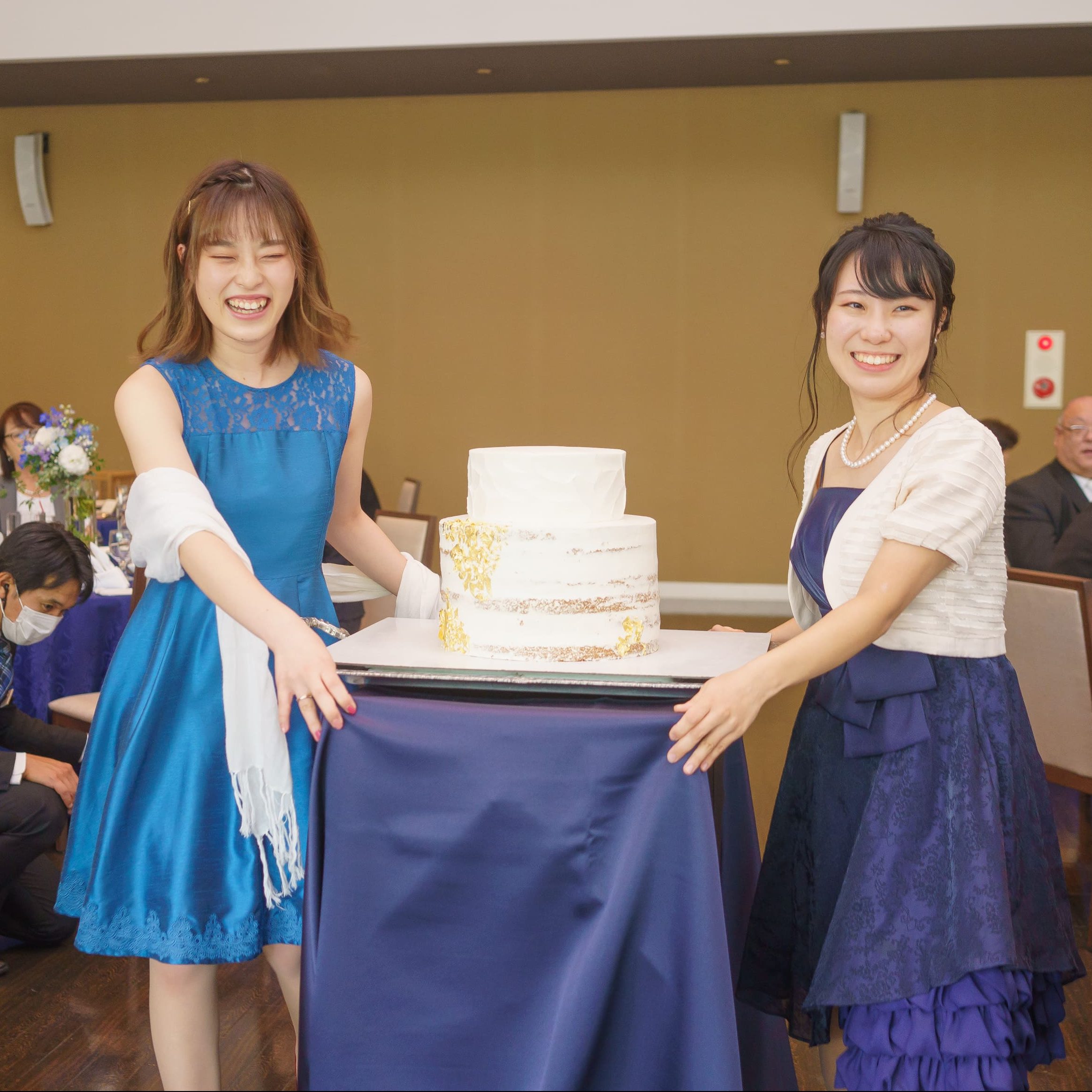 (新郎)1ヵ月前くらいからスタッフの方と一緒に練習を始めて、当日の朝も練習をしました。練習の時はとてもうまくいきましたが、当日の朝はなぜか成功できず不安な気持ちのまま本番を迎えました。本番は、思い切ってナイフを振り抜くと「おお!」という歓声が起こっていて、なんとか大成功。挙式中もそのことがずっと気になるほど一番の緊張でしたが、成功して良かったです。笑