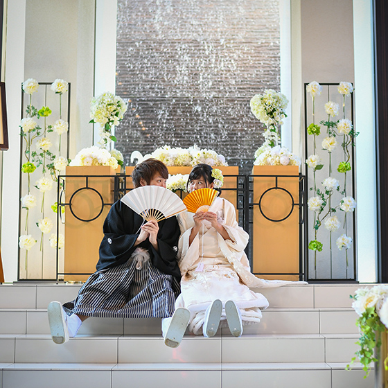 式前日の夜は楽しさと緊張のあまり、本当に一睡もできなかったのを覚えています。朝式場につき、最後の飾り付けをして、着替え、お互いの両親・親戚への挨拶をして、通しで軽く練習をし、いよいよ挙式本番。