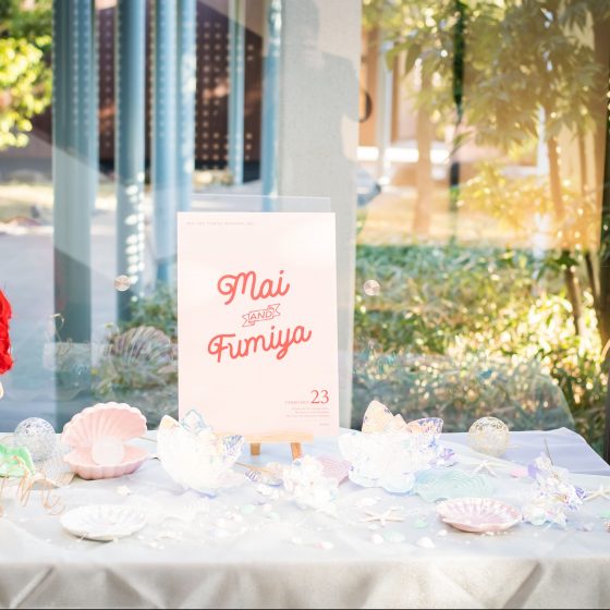 そして何よりこだわったのは、絶対に妥協しないこと!!!飾り付けは、海の中をテーマに貝殻や風船など自分のイメージに合うものを色々な所で探して、気に入ったものを集めました。納得のいくとっても可愛い会場を作ることができて、プランナーさん達が褒めて下さり、嬉しかったです!!