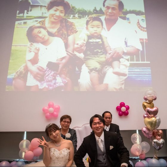 私たちは家族・親族のみの式だった為、感謝の気持ちを伝えること、固くならずアットホームな式にすることを第一に考えていました。座席にはひとりひとりとの思い出の写真にメッセージを書いて飾ったり、タイムスリップフォトでは父母だけではなく祖父母や兄妹と関わる時間を作ったり、来てくれた家族親族に感謝の気持ちが伝わるように考えました。