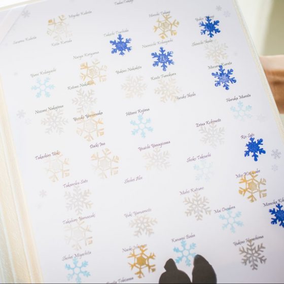 ②スノボ・冬婚のイメージを雪の結晶のモチーフで表現するため、ウェディングケーキのデコレーションを雪の結晶のチョコレートにしたり、リングピローにモチーフを使ったり、2人のカフス・イヤリングに雪の結晶を取り入れたほか、結婚証明書の承認スタンプを雪の結晶にすべく手作りしたこと